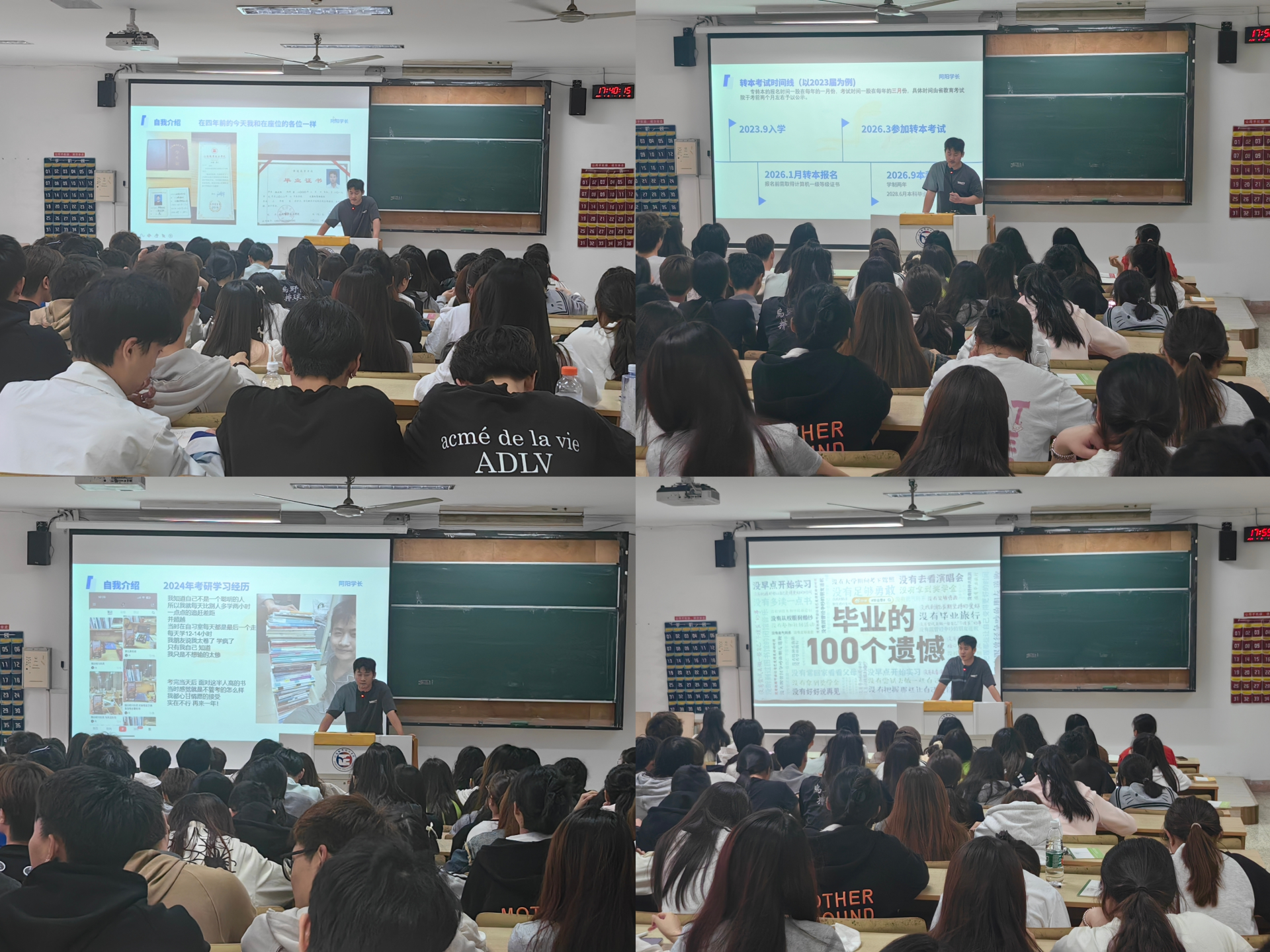 给自己一个清晰的定位,清楚的知道自己想干什么,怎么干?这是学生学习的源动力,如何开展有效、高效的学习,努力克服奋斗路上的困难,如何做到脱颖而出,时刻做好准备,实现机会都是留给有准备的人的,这是他行动的指南。进行分享的陆正阳,通过“代入式”的宣讲向大家讲述了自己的大学期间转本经历、生活经历以及考研经历。