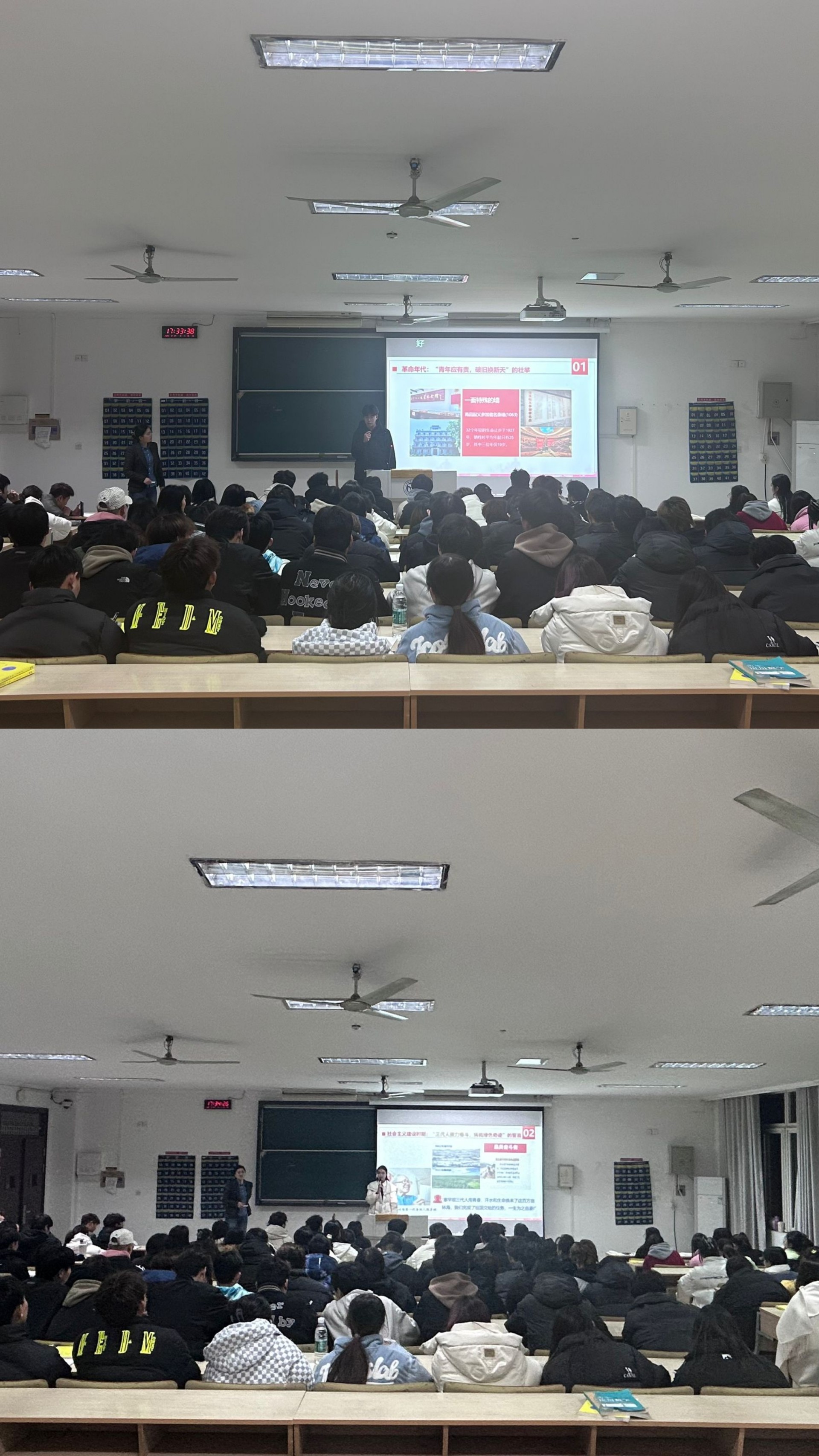 一开始三位同学生动讲解了南昌八一起义、期塞罕坝机械林场先进群体和中国女排的事迹,最后于老师为大家讲述了中国航天团队的动人故事。一代代中国青年把青春奋斗融入党和人民事业,为人民战斗、为祖国献身、为幸福生活奋斗,谱写了一曲又一曲壮丽的青春之歌,让同学们深受启发和鼓舞,胸中燃起报效祖国的热火。