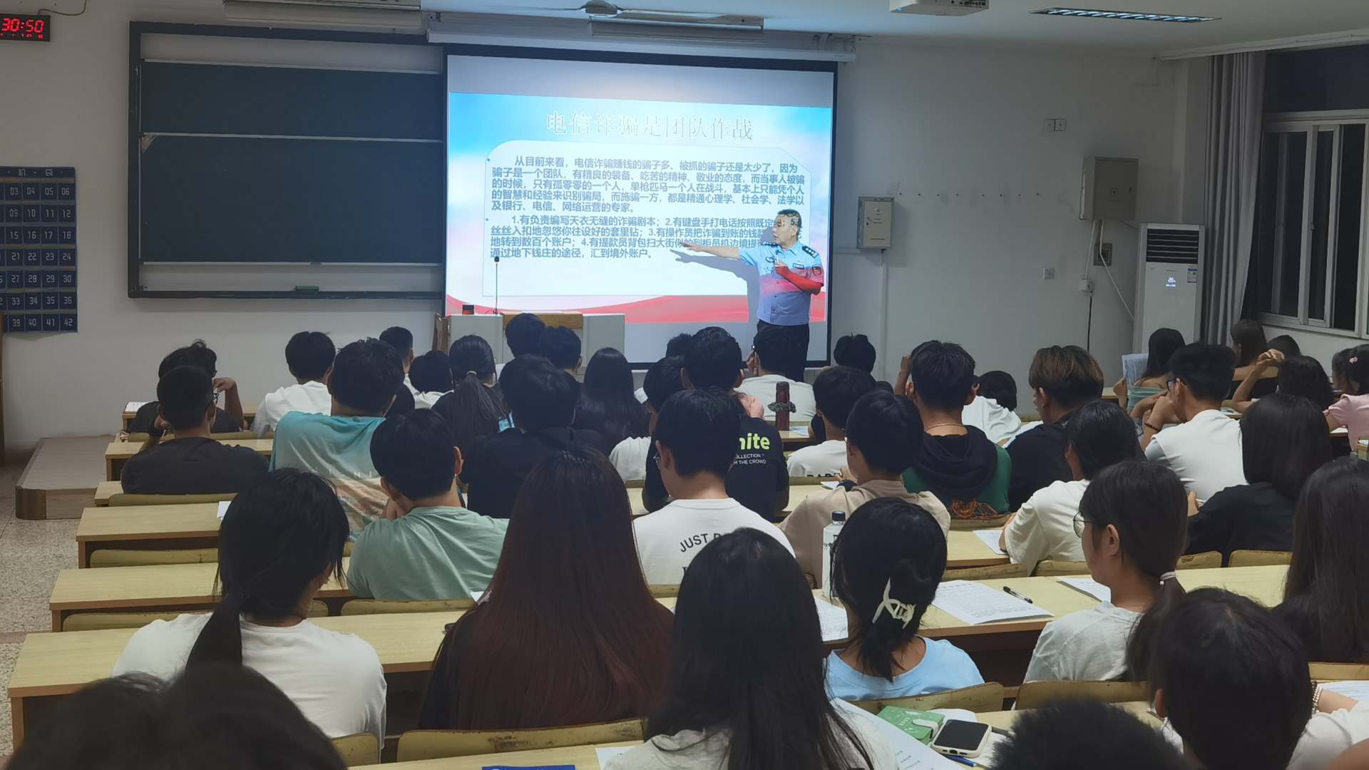 娄警官通过列举发生在校园内的网络诈骗典型案件,对网络游戏、冒充熟人诈骗、网络产品虚假交易、充值返利等高发、频发的网络诈骗进行了深入剖析,向新生宣讲识别、防范电信网络诈骗的小技巧,提醒大家不轻信花言巧语、不向陌生人转账、不透露个人信息,筑牢反诈防线、维护自身合法权益,引导学生养成不明电话及时挂、可疑短信不理他、陌生链接不要点、小心病毒保密码、游戏充值是欺骗、不明收款是诈骗、若遇此事不理他、及时醒悟告警察的反诈意识。