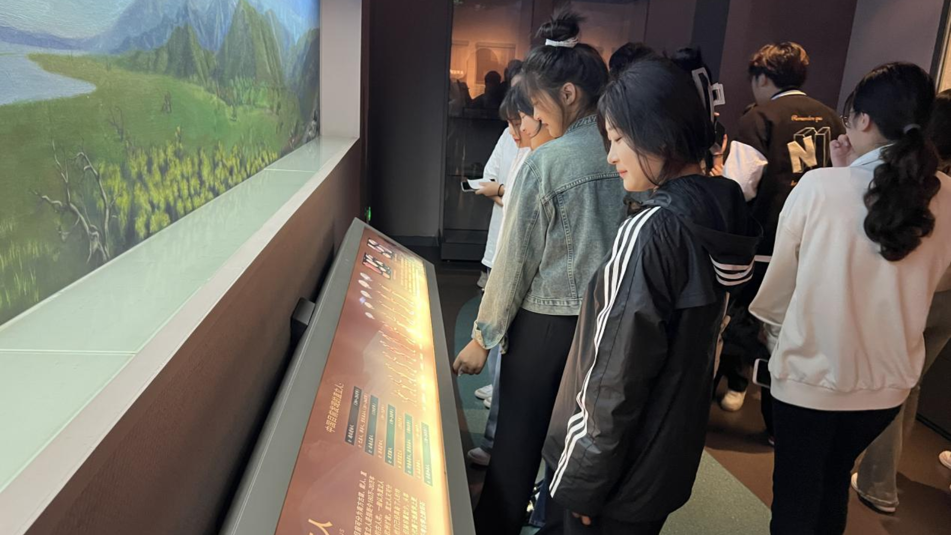 江宁博物馆位于竹山公园东侧,由主馆和东晋历史文化博物馆两部分组成。同学们首先来到东晋历史文化博物馆。墙壁上展示着大型的金箔漆画《女史箴图》、《洛神赋》、《兰亭集序》,瓷板画《新亭集会》以及东晋人文石刻浮雕,营造出浓郁的东晋历史文化氛围。大家通过展厅内的展板、文字、文物、影像资料,多方位认识了那个时期的历史以及王导、谢安、王羲之、顾恺之等东晋风流人物。