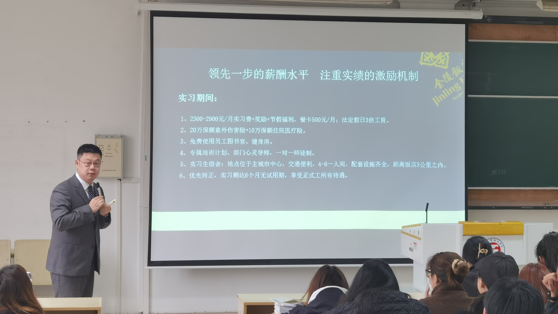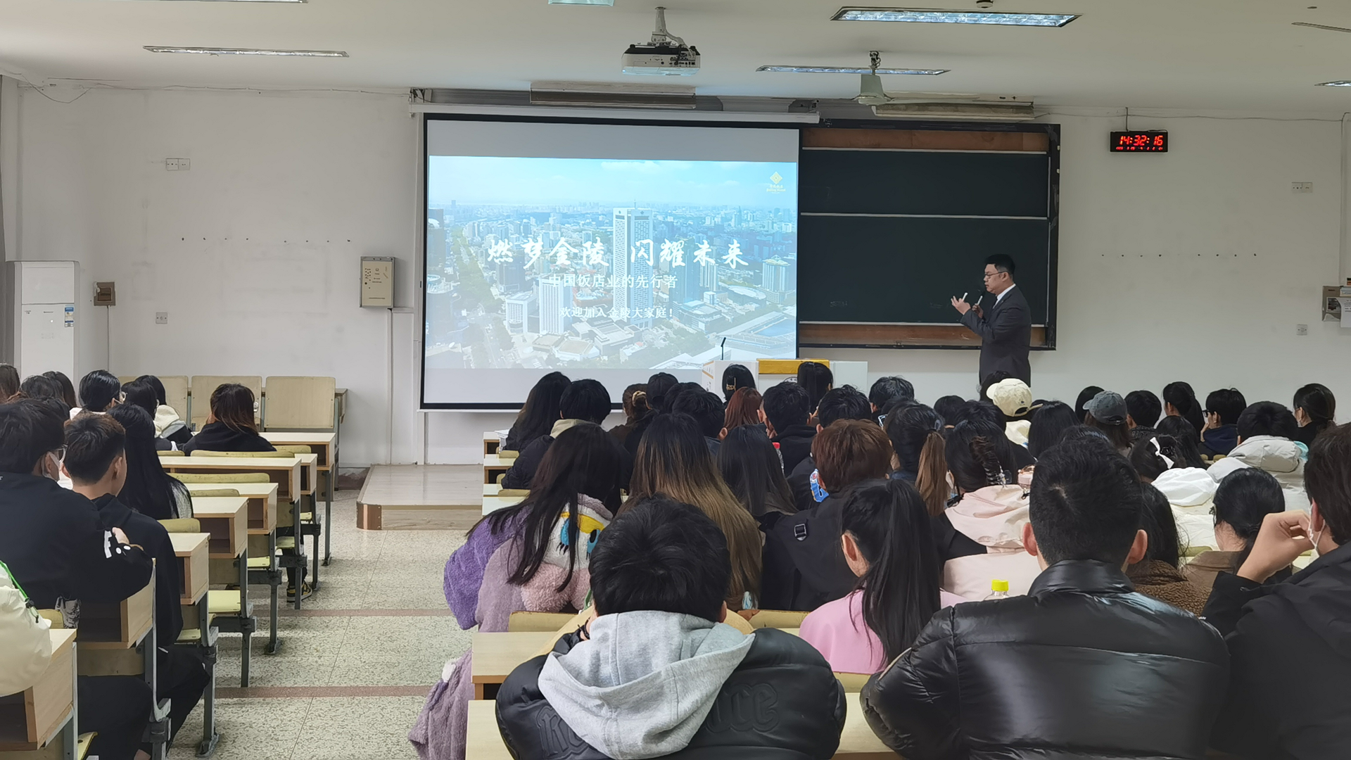 这次南京金陵饭店集团有限公司提供的都是为培养技术技能型人才和基层管理人员做储备的岗位,就业前景十分广阔。宣讲会上,企业负责人为同学们详细介绍了户外露出、企业概况、员工的薪酬福利待遇以及住宿情况,重点讲解了本次宣讲的岗位信息和岗位发展的空间。宣讲结束后大家对关心的问题进行了提问,企业负责的同志一一作了解答。