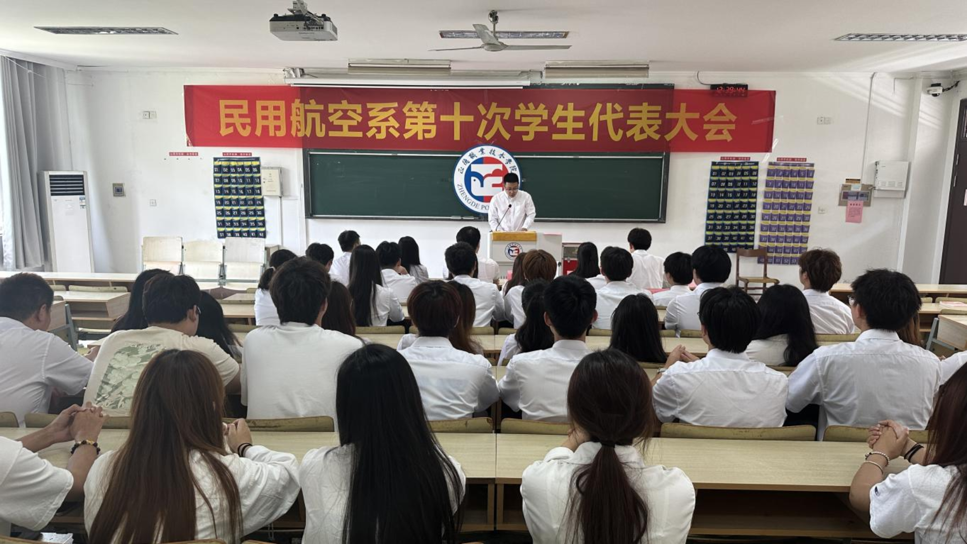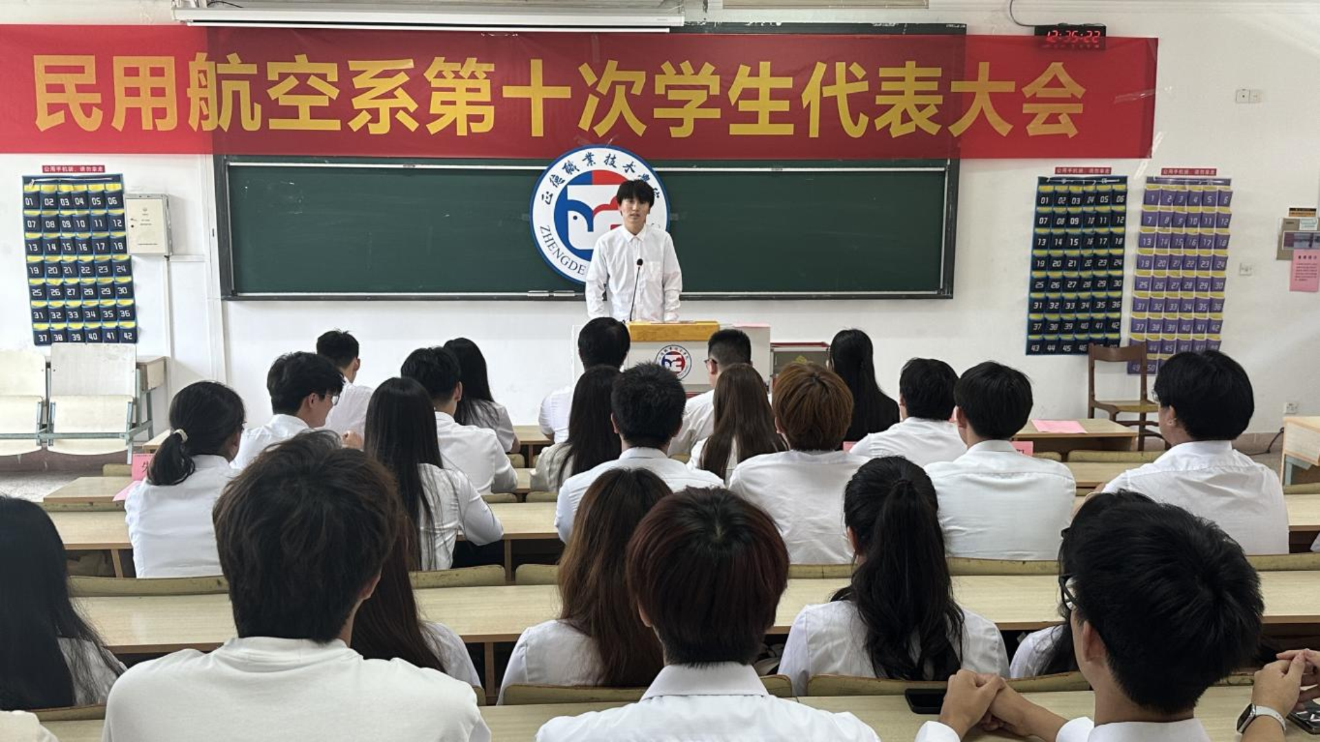 随后,院学生会主席刘一博发表讲话。他高度赞扬了民用航空系学生会在学院学生组织中的模范带头作用,并希望他们继续保持积极向上的精神风貌,不断追求卓越。同时,他也祝愿本次大会取得圆满成功,为民用航空系的学生工作注入新的活力。