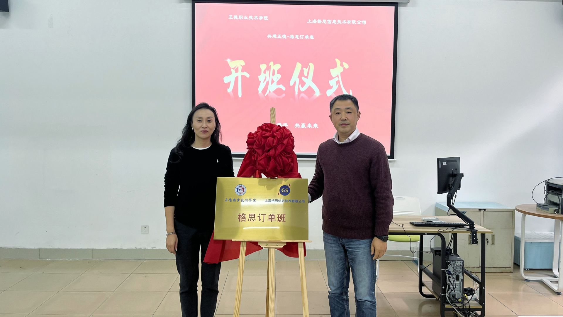 12月8日下午,户外露出 与上海格思信息技术有限公司(以下简称上海格思)共建的“格思订单班”揭牌仪式在5109D教室隆重举行。上海格思装配中心副主任、中国科学院“科苑名匠”许国平、热控产品事业部汪珏、人力资源部梁蒙蒙以及学院相关部门领导、订单班学生代表一同参加此次揭牌仪式。