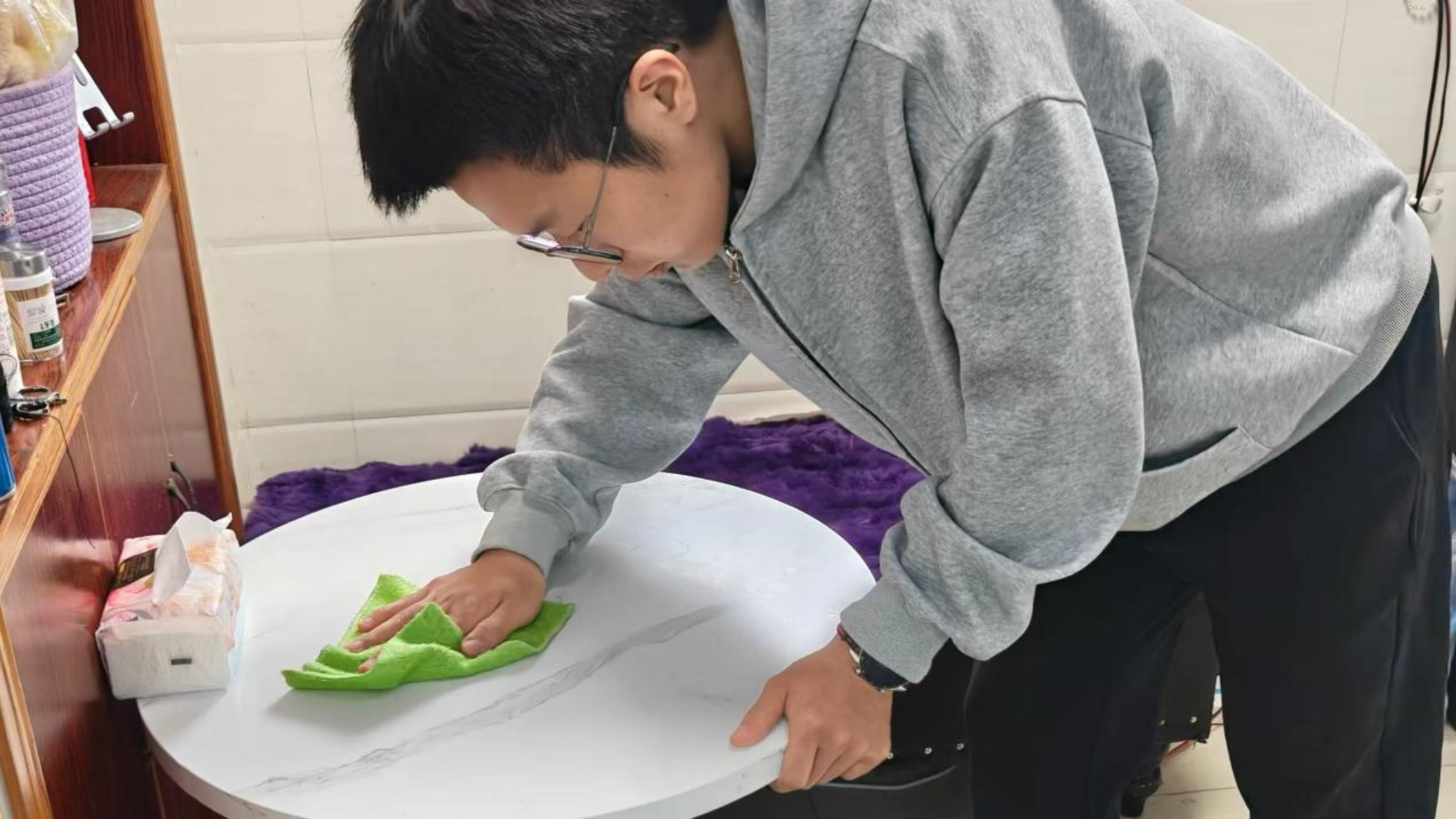 活动中,学生结合自身特点制定“劳动能力提升清单”,涵盖内务整理、基础烹饪、室内清洁等模块。24级飞机机电设备维修专业学生通过“每日劳动打卡”,在叠被子、清洁居室中磨炼耐心。