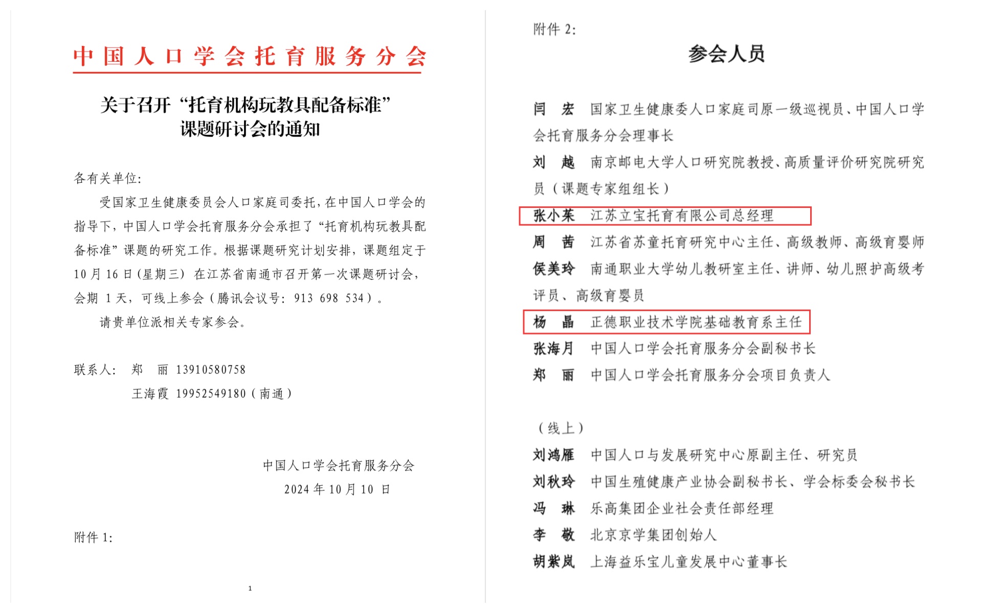 2024年10月17日,受国家卫生健康委员会人口家庭司委托,中国人口学会托育服务分会承担的“托育机构玩教具配备标准”课题的研究研讨会在南通召开,户外露出 张小茱教授,基础教育系杨晶主任应邀参会并作会议发言。