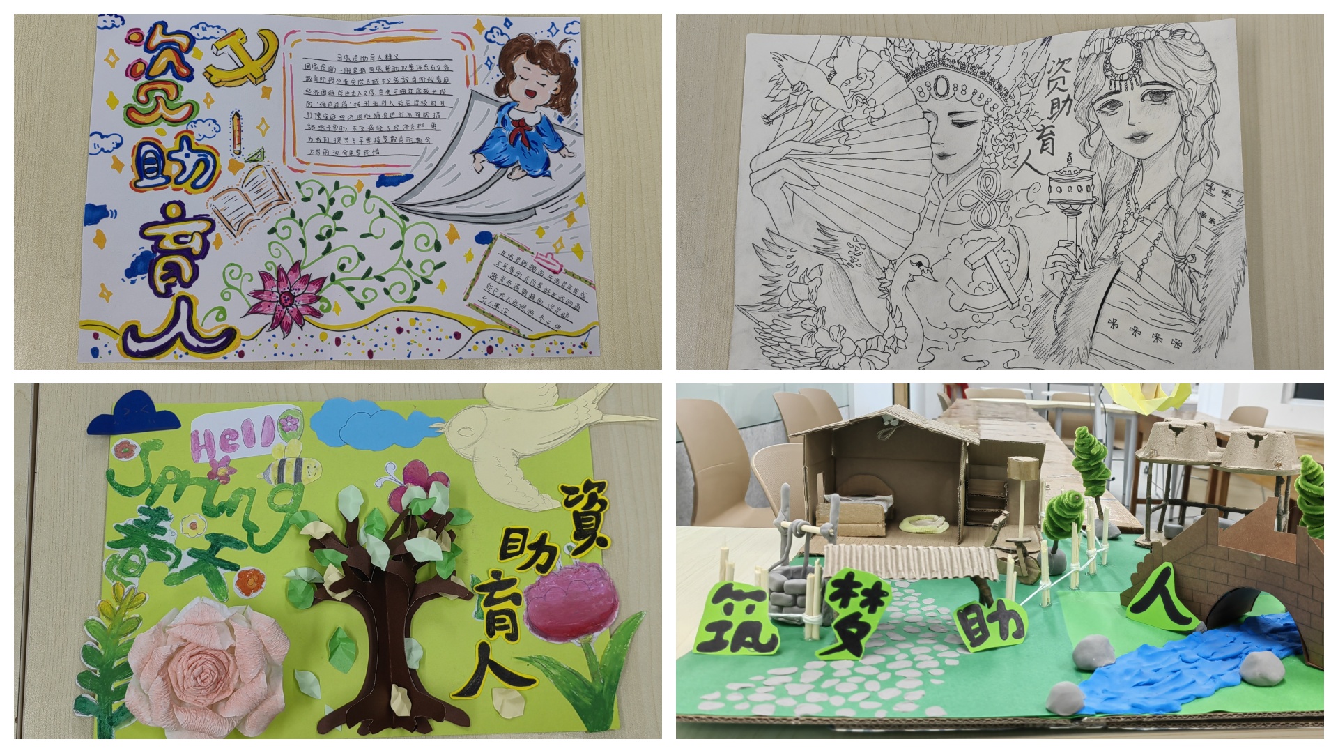 活动期间,受资助学生经过在专业教师教学后,发挥创意,利用彩纸双面胶等材料制作出一系列兼具美观与教育意义的环境创设作品。从充满童趣的幼儿园主题墙饰,到富有文化气息的校园文化展板,作品都凝聚着学生们的智慧与汗水,展示了他们在艺术设计、手工制作等方面的成长与进步。