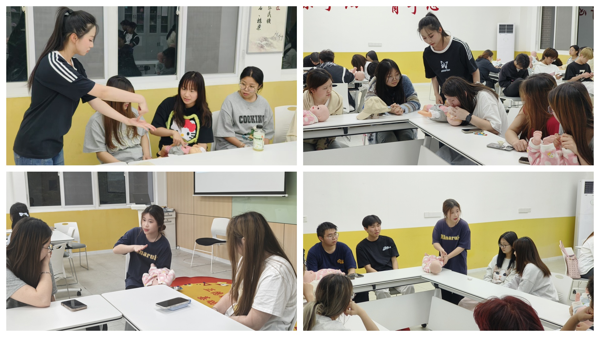 示范结束后,两位同学走到学生身边手把手指导。力度、频次、按压位置,每一个细节都被逐一纠正;每一名同学都在实际操作中完成了从观摩到掌握的飞跃。“原来看似简单的动作,做起来这么讲究!”不少同学感叹道。通过这场沉浸式体验,同学们不仅提前接触了婴幼儿急救实训内容,也进一步体会到“学风建设”所倡导的“求真务实”精神。