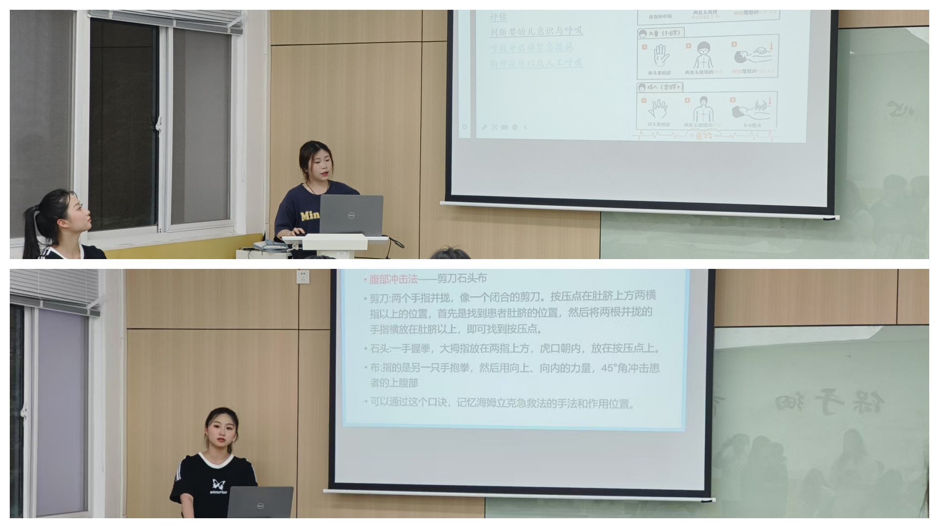 “学以致用,严谨求实”是本次活动的核心导向。谢永昕、邱文静两位讲师分别借助婴儿、幼儿人体模型,标准演示了一岁以下、一岁以上儿童的“海姆立克法”与“心肺复苏”操作要点,并反复强调“黄金4分钟”在抢救生命中的决定性意义。简洁清晰的要点加上行云流水的动作,将专业化操作变成可视化、可模仿的技能。