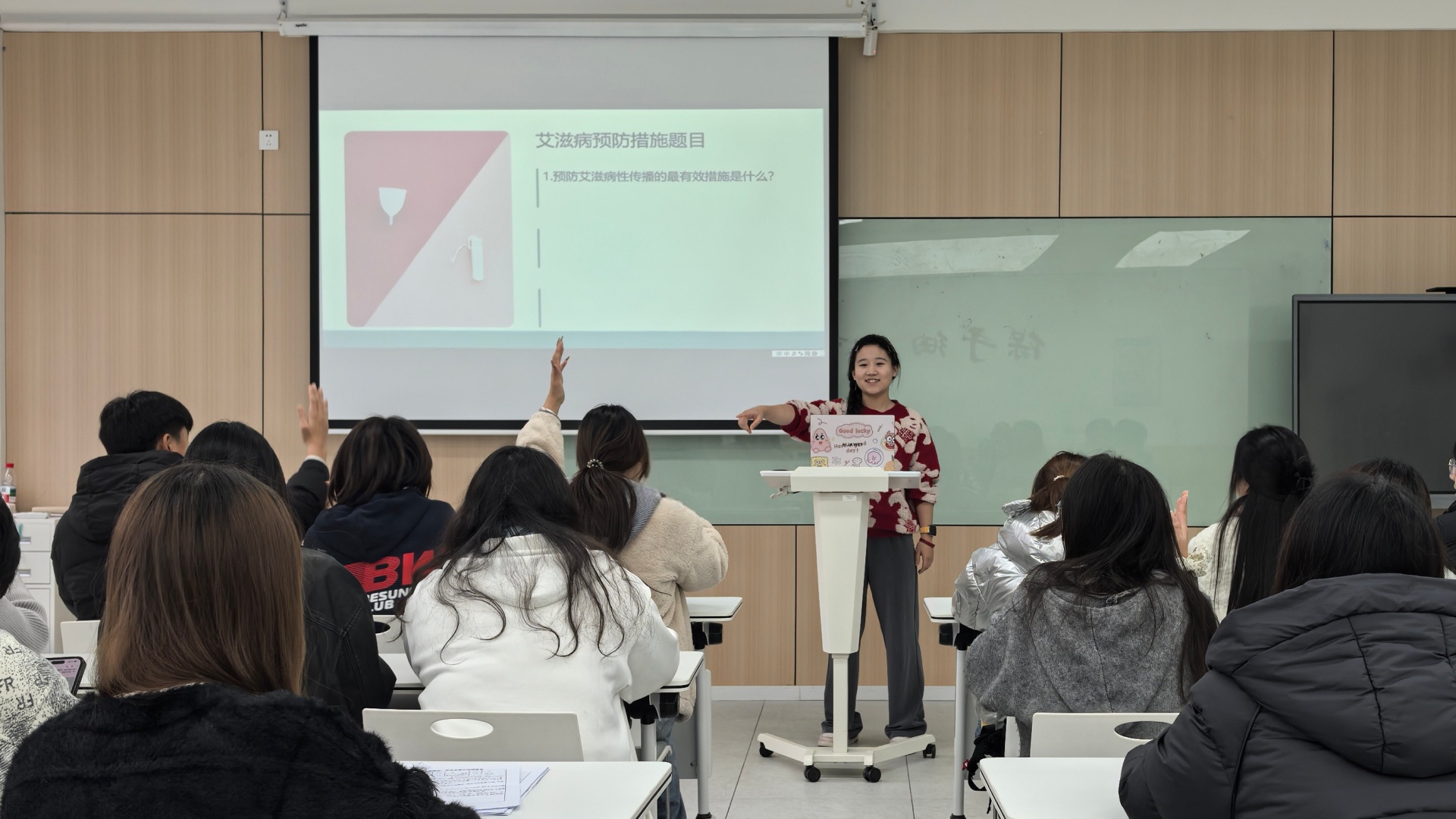 基础知识讲解后,王宇晴学姐组织开展艾滋病知识竞赛。竞赛设置必答题、抢答题等环节,题目涵盖传播途径、预防措施、反歧视理念等核心知识点。现场选手答题踊跃,台下同学热情互动,在趣味竞技中深化了防艾知识记忆。同学们纷纷表示,竞赛让严肃的健康知识变得易懂易记,进一步明确了自我保护的重要性。