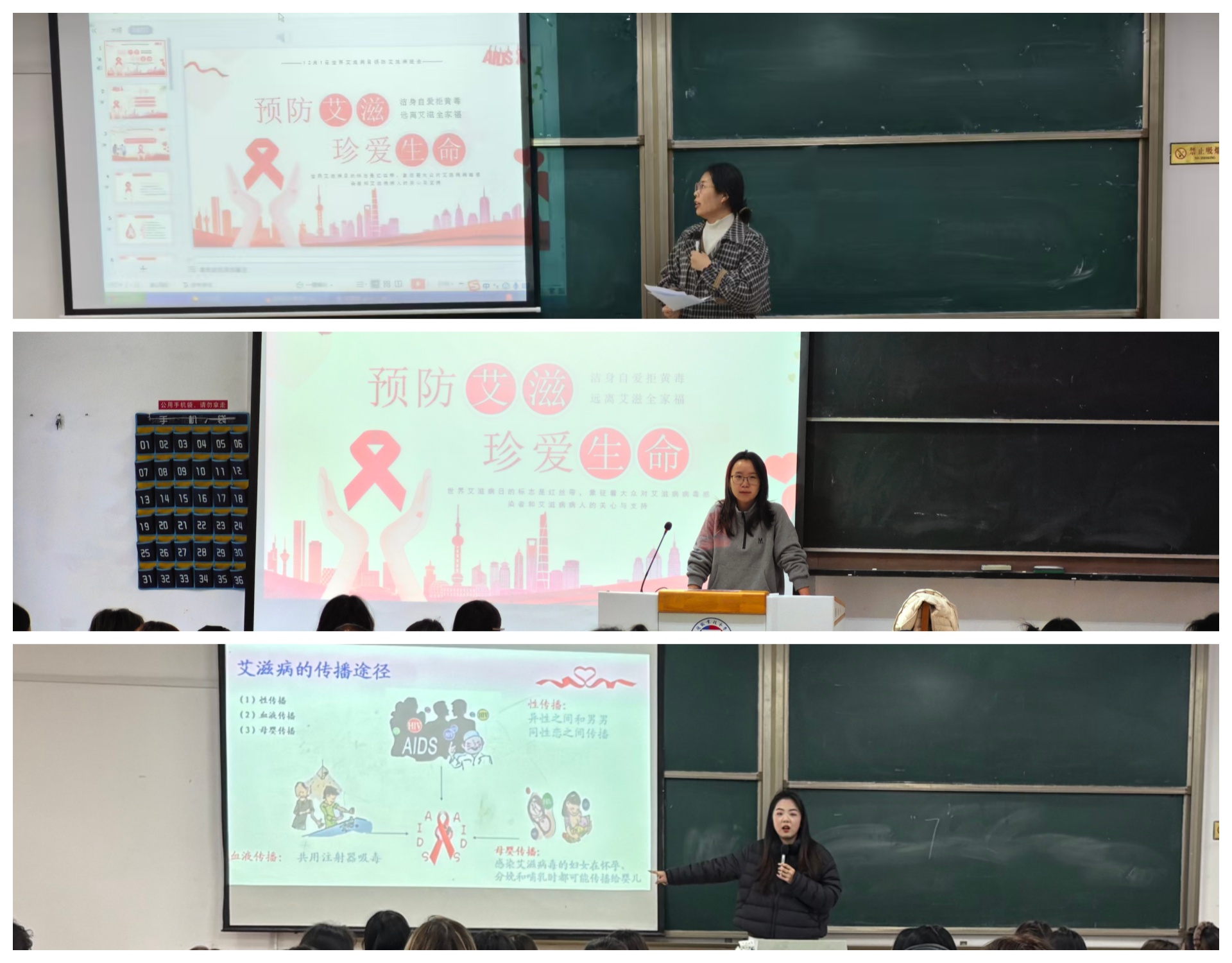 活动中,沈言静、刘翠云、赵雨涵三位老师走进各班级,结合青少年认知特点,用通俗易懂的语言向同学们讲解艾滋病的传播途径和预防措施等基础知识,重点澄清“日常接触会传染”等认知误区,着重强调性接触、血液、母婴三大核心传播途径的防控要点。同时通过案例警示、互动问答等形式,引导同学们树立健康责任意识,倡导以包容心态关爱艾滋病病毒感染者。