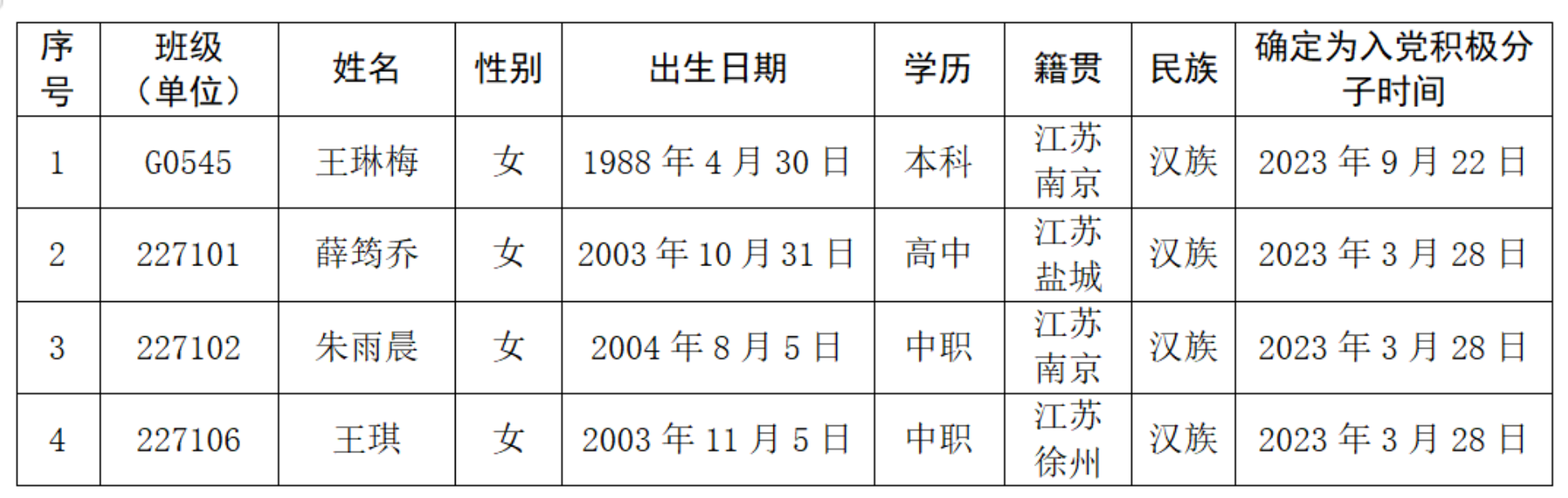 经党支部培养教育和考察,在听取党小组、培养联系人、党员和群众意见的基础上,经支委会2024年10月17日讨论,拟确定王琳梅、薛筠乔等4位同志为发展对象。根据发展党员工作有关要求,现将其有关情况予以公示(见附件)。