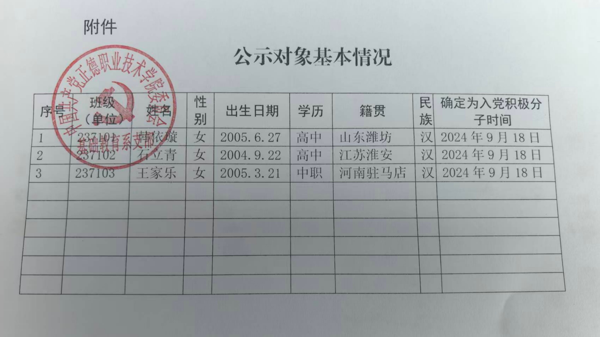 经党支部培养教育和考察,在听取党小组、培养联系人、党员和群众意见的基础上,经支委会2025年10月17日讨论,拟确定韩依璇、石立青、王家乐同志为发展对象。根据发展党员工作有关要求,现将其有关情况予以公示(见附件)。