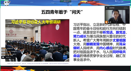 全体思政课教师及时将习近平总书记的重要讲话精神融入课堂教学,并结合总书记给首届大国工匠创新交流大会的贺信、《新时代的中国青年》白皮书、中国共青团成立100周年、疫情防控等近期时政热点设计教学内容,达到了沟通心灵、启智润心、激扬斗志的目的。