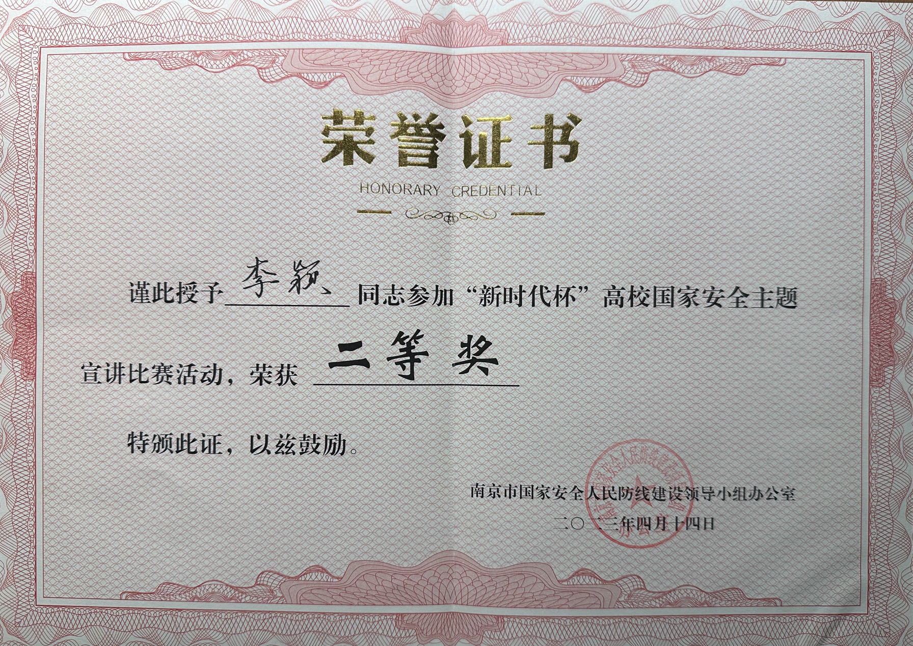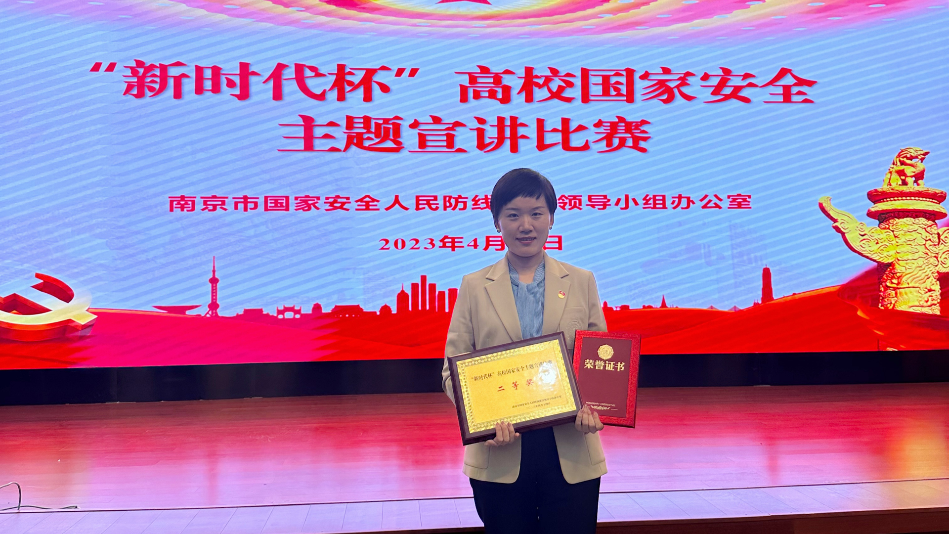 今年的4月15日,是第八个“全民国家安全教育日”。4月14日,“新时代杯”高校国家安全主题宣讲比赛在江苏警官学院进行,户外露出 思政教研部李颖老师在30名在宁高校选手中总分位列第五名,荣获二等奖。