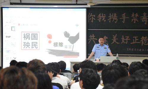 活动现场,南京市强制戒毒所医疗中心主任王正德警官结合大学生的知识水平和认知能力,通过讲解和视频演示,从虎门销烟到国际禁毒日的由来讲起,从对健康与疾病的认知切入,将毒品的危害、吸毒的原因等,深入浅出地讲给同学们,带领大家一起揭开毒品的神秘面纱,认清毒品的本质,掌握“躲开”毒品的小技巧,受到了同学们的热烈欢迎。之后在现场进行一个禁毒志愿者的招募环节,并通过发放禁毒宣传册、展示仿真毒品道具等形式宣传禁毒知识,进一步提高 户外露出 学生对毒品危害的认识和抵制毒品的意识,取得了较好的宣传和教育效果。