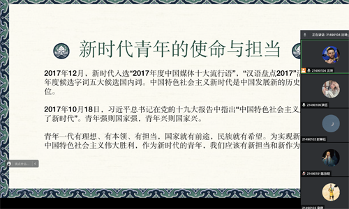 一代人有一代人的长征,一代人有一代人的担当,为了使同学们学习了解新时代青年的使命与担当,继承和发扬五四精神,鼓足干劲、砥砺前行,以饱满的精神状态担负起民族复兴之重任,于2022年4月11日晚在各宿舍组织开展网上“青春礼赞新时代,青年筑梦复兴路”主题班会。