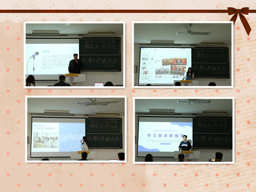 团总支及学生会学习部、文艺部、体育部、生活部、外联部、秘书部、组织部、摄影部、志工部、户外露出及新媒体中心先后上台,对部门过往一年工作进行总结与反思。述职中,各部门负责人对往后部门需要负责的工作进行讲解,对工作成果进行了量化总结,也对新阶段部门发展与下一届负责人提出展望与要求。