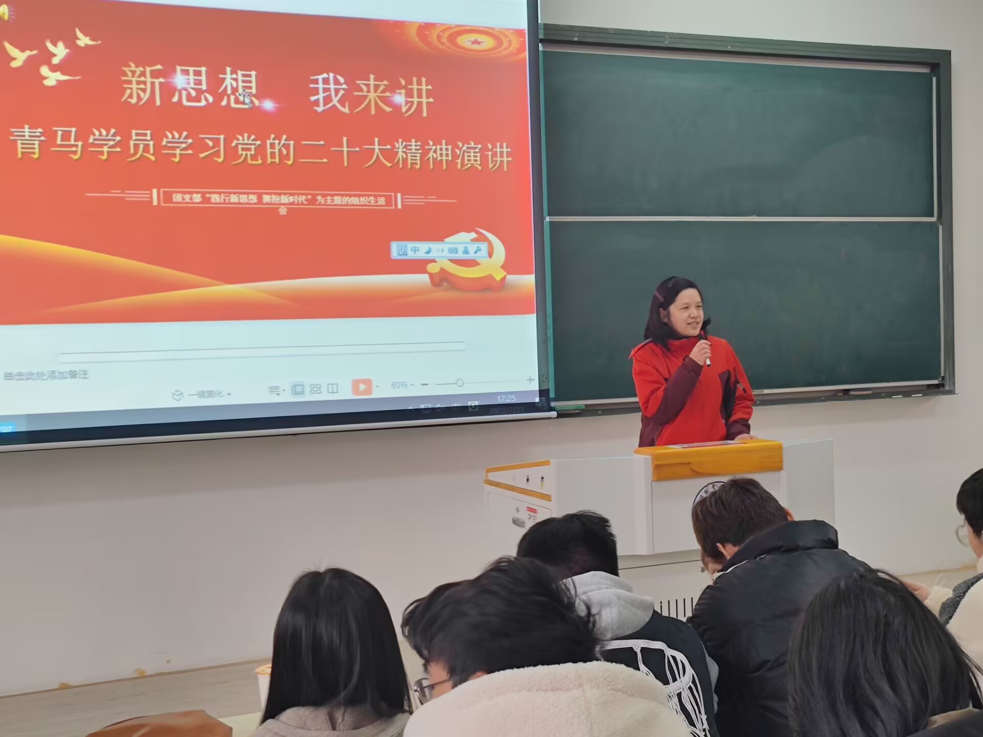 范小军老师将自己对二十大精神学习的理解全数教予大家,并结合自身的日常生活和工作经验,从微入细、深入浅出,“原原本本学、踏踏实实干、清清白白做”,反复强调“勿以善小而不为,勿以恶小而不为”,指导我们做一个温柔且坚定的人,对别人善良,在不久的将来别人也会善待自己。吴青老师也给予我们未来方向,我们还年轻,未来有无限可能,道阻且长,行则将至,一步一步把自己该做的事情做好,努力学习该掌握的东西,方法总比困难多,冰雪融化了是因为太阳出来了。
