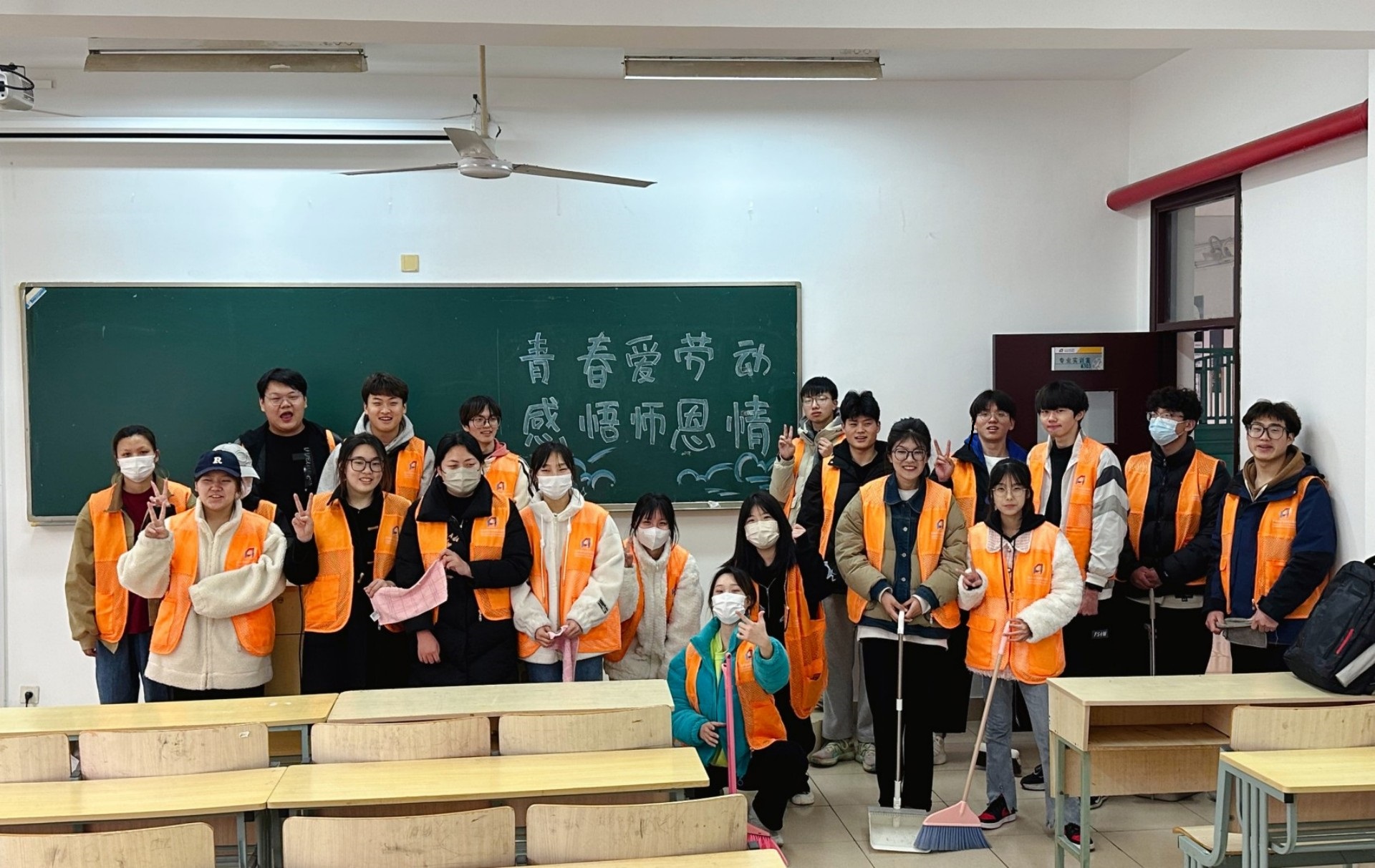接下来辅导员廖晶晶老师从培养劳动精神出发,阐述了大学生劳动教育的意义,带领同学们进行了劳动教育活动,活动内容为打扫8号楼三层9个教室。活动伊始,班级生活委员为同学们划分小组布置任务,并对清洁程度提出要求。接着,同学们们对黑板槽进行粉笔灰清理,并对讲桌进行物品摆放整理。最后,全体同学以合影留念的方式结束了这次活动。“这次打扫教室不仅让我们体会到雷锋无私奉献的快乐,同时通过这次活动,我们为老师提供了一个干净的讲台,也借此报答师恩。”一位同学如是说。