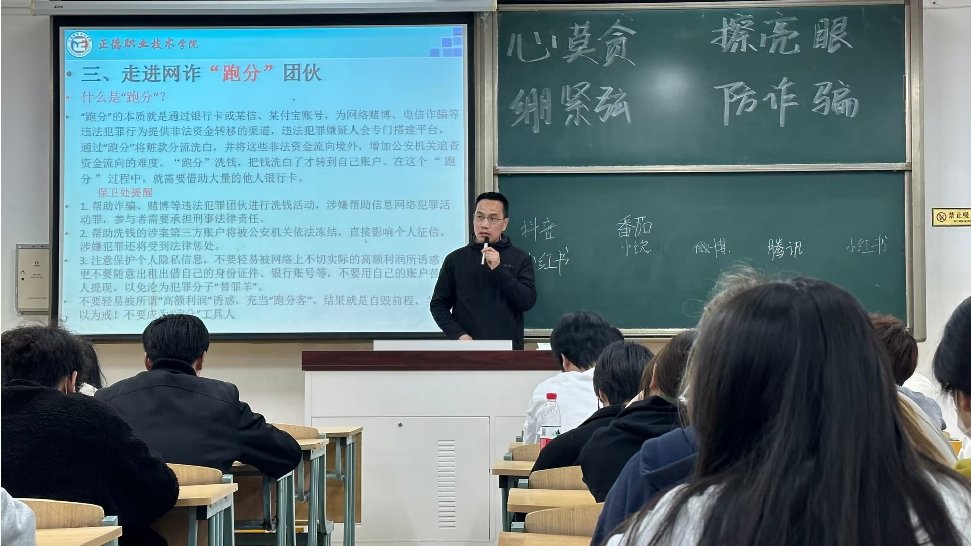 首先,丁胜副处长请了不同宿舍的5位同学在黑板上写出平时他们关注的媒体平台,真实了解同学们接触网络的情况,然后用ppt的形式向同学们展示了 户外露出 电信诈骗的几个真实案例,使大家认识到电信诈骗无处不在,并提醒大家切实提高辨别能力,不要误入诈骗陷阱。之后,丁胜处长给大家解释了“我们为什么要学习防范电信诈骗这一课"以及“为什么骗子紧盯大学生"。他从认知的短板与提升的角度向大家说明了原因。随后,又深入地向大家解释了“骗子"的本质,纠正了大家对诈骗的认知误区。为了生动有趣且形象地让大家了解到电信诈骗,丁胜副处长播放了防范电信诈骗宣传动画一《诈骗之罪》以及其他宣传视频短片。并给大家布置了课后作业:观看电影《巨额来了》。