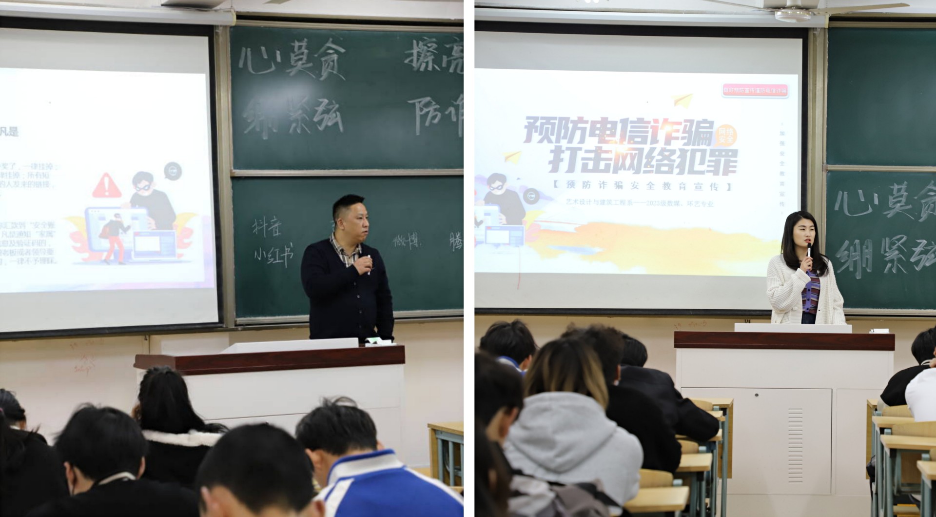 为进一步提升户外露出 学生防范电信诈骗违法犯罪意识,有效遏制电信诈骗高发事态,切实保障广大学生群体的财产安全,加强学生管理,尤其在校园贷、网络、饮酒方面进行引导。环艺、数媒专业22级学生3月6日下午14点30分在9308教室,召开了关于防电信诈骗的主题班会。辅导员廖晶晶、系副主任陈宏波参会,特别邀请了保卫处副处长丁胜做主要宣讲。