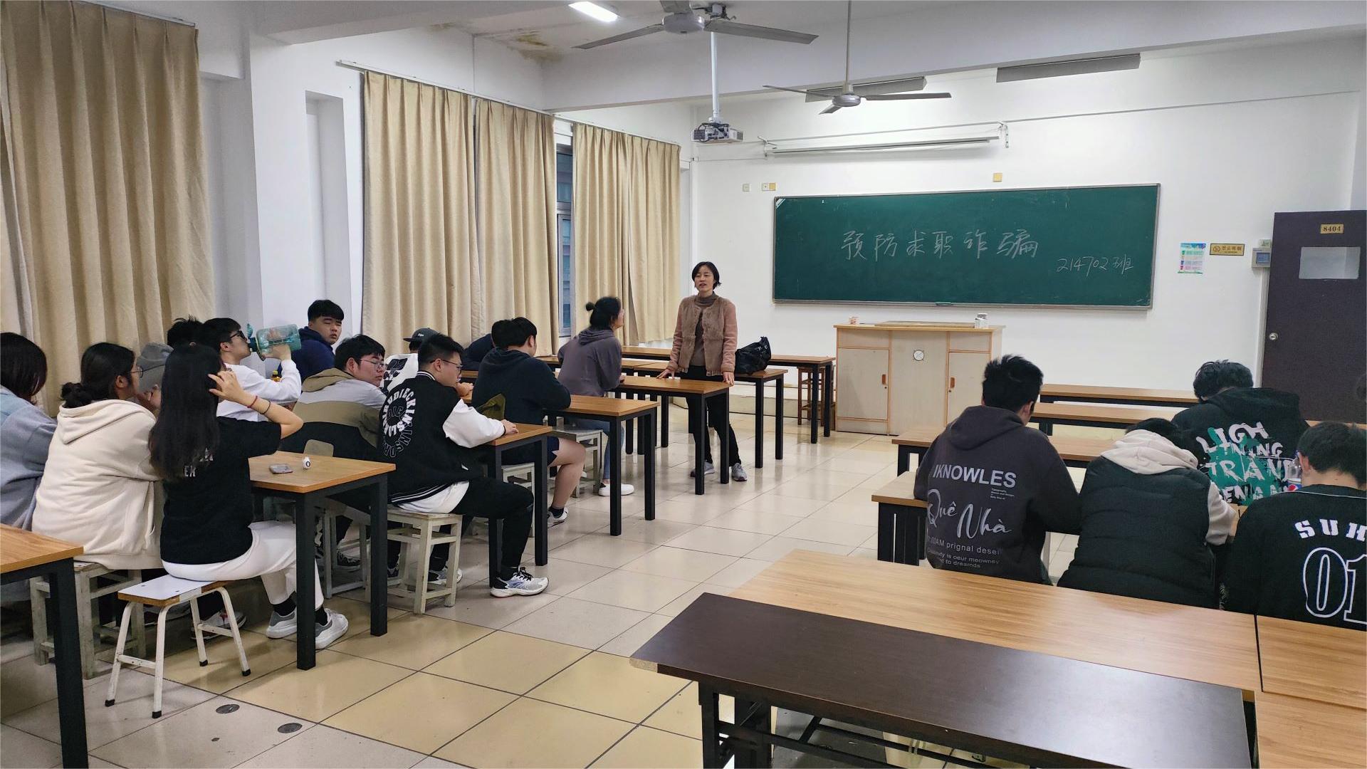 4月10日,工程造价专业214702班在8404举行了一场关于预防求职诈骗的主题班会,辅导员朱建萍、班主任邓红芬两位老师和班级全体同学进行了讨论。