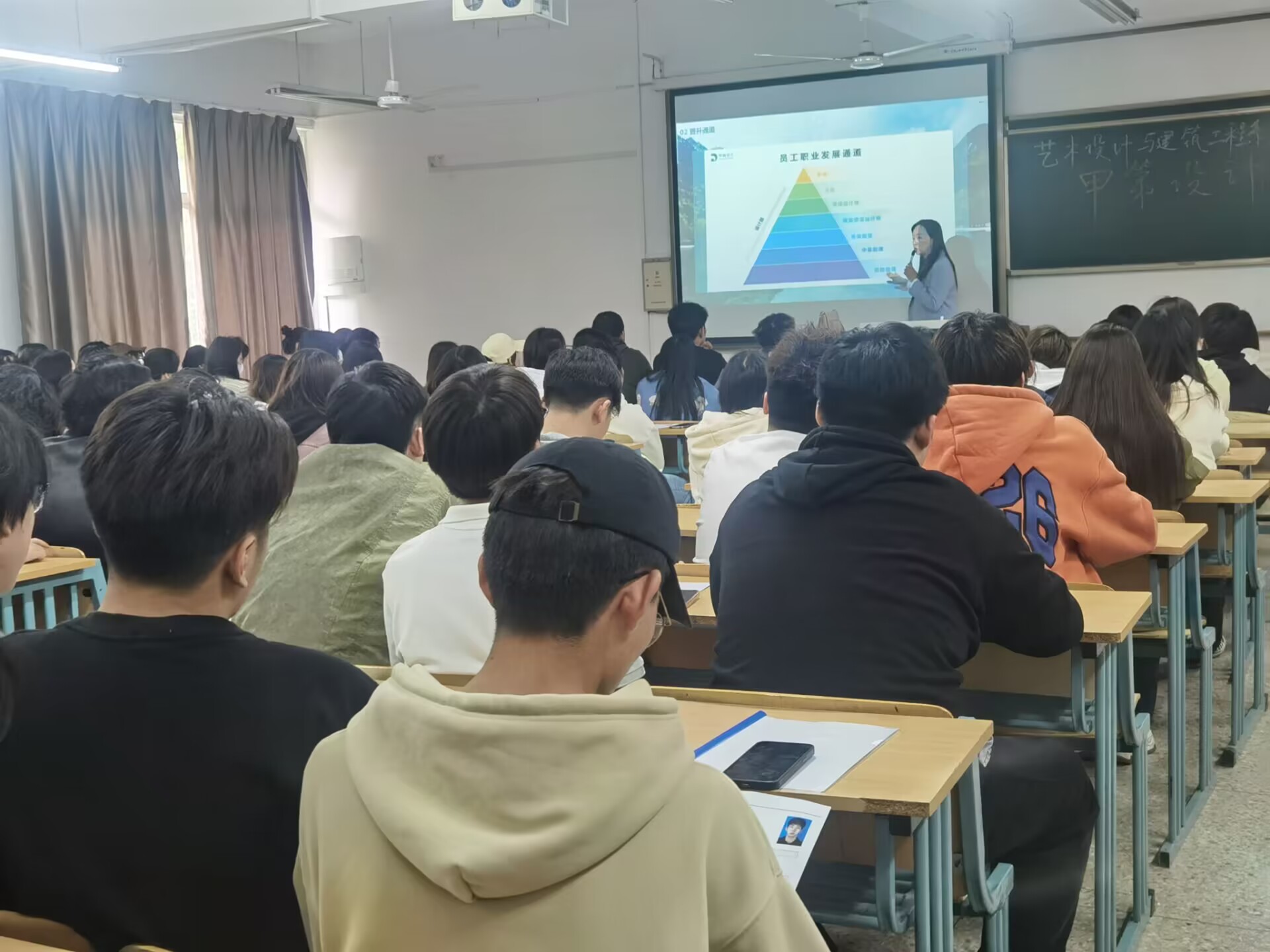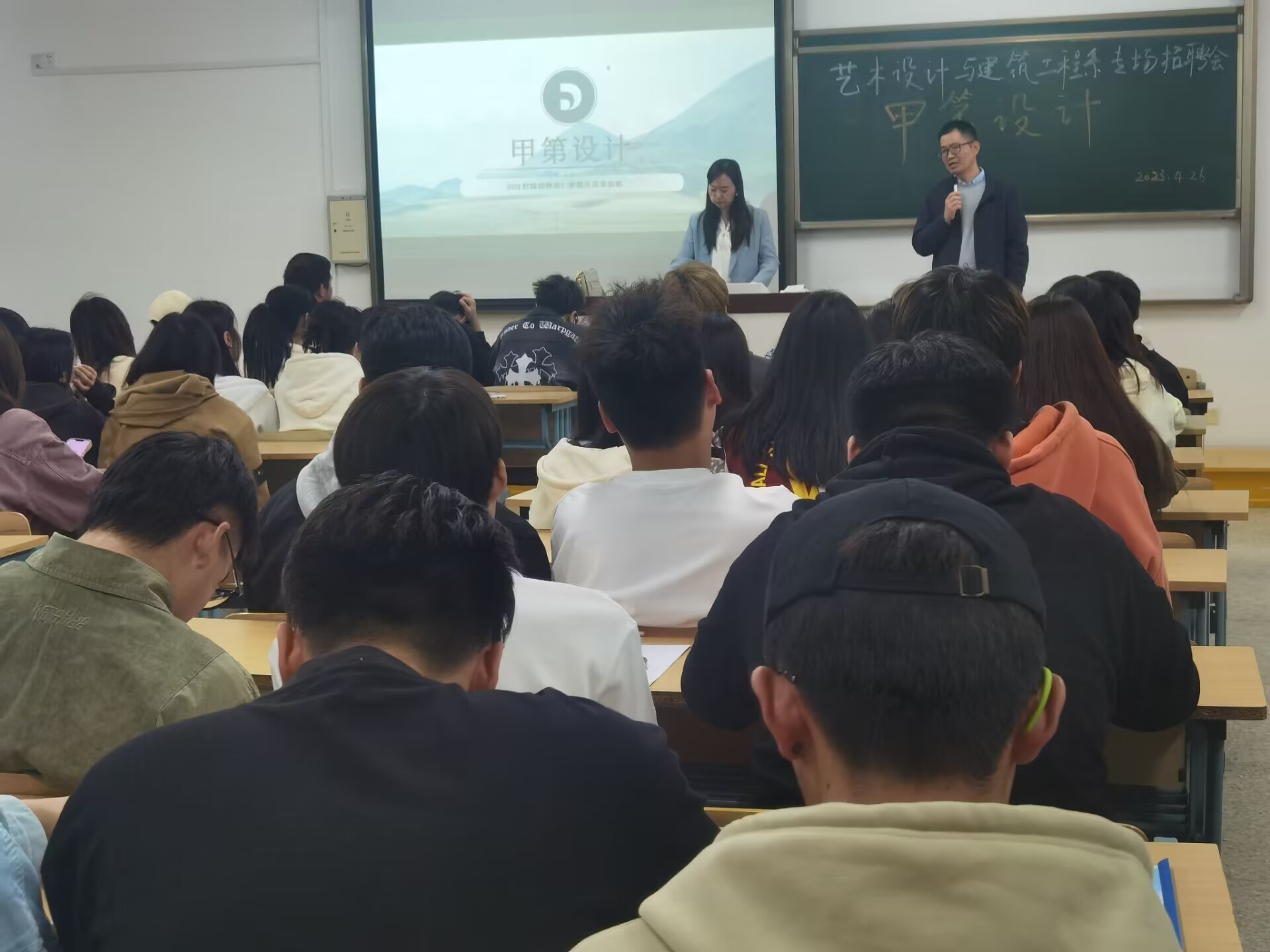 为了促进2021级学生高质量完成岗位实习,加深学生对用人单位及行业的认识,2023年4月26日,艺术设计与建筑工程系邀请江苏甲第景观设计工程有限公司负责人进校宣讲。2021级全体环境艺术设计和室内设计专业的同学参加了宣讲会。