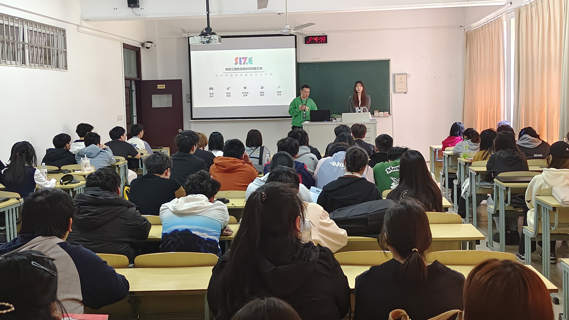 公司方通过播放宣传片、展示PPT,向同学们全面介绍职业方向、岗位需求。明确提出了需要3D动画师、3D角色美术师、角色原画师等职位的人才。“大家不仅要会玩游戏,还要会做游戏。”接着, 宣讲人为同学们简述了游戏的制作过程,以及列举了在不同的公司要做的工作,同时针对大家关心的工作时长、薪资待遇、工作环境等问题进行了详细讲解。宣讲人思路清晰,言简意赅,充满热情与激励的话语深深吸引着同学们,大家都在积极互动,提出自己对技术与行业的问题。最后,公司方鼓励大家精心准备、勇于尝试、积极就业。
