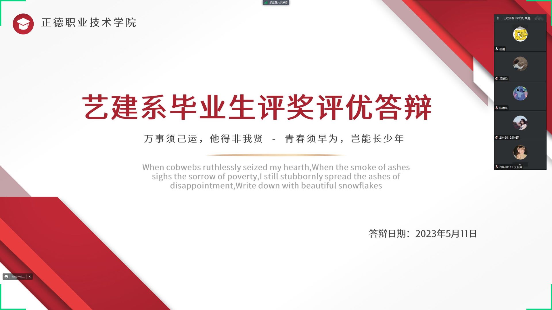 全面贯彻落实立德树人根本任务,充分发挥大学生先进榜样的示范引领作用,评选出一批思想正、品行优、能力强的优秀毕业生,进一步推动学风建设和校园文明建设,艺术设计与建筑工程系根据《户外露出 关于做好 2023届毕业生评优工作的通知》,本着公平、公正、公开的原则,于腾讯会议开展了2023届优秀毕业生三好学生、以及优秀学生干部答辩会。