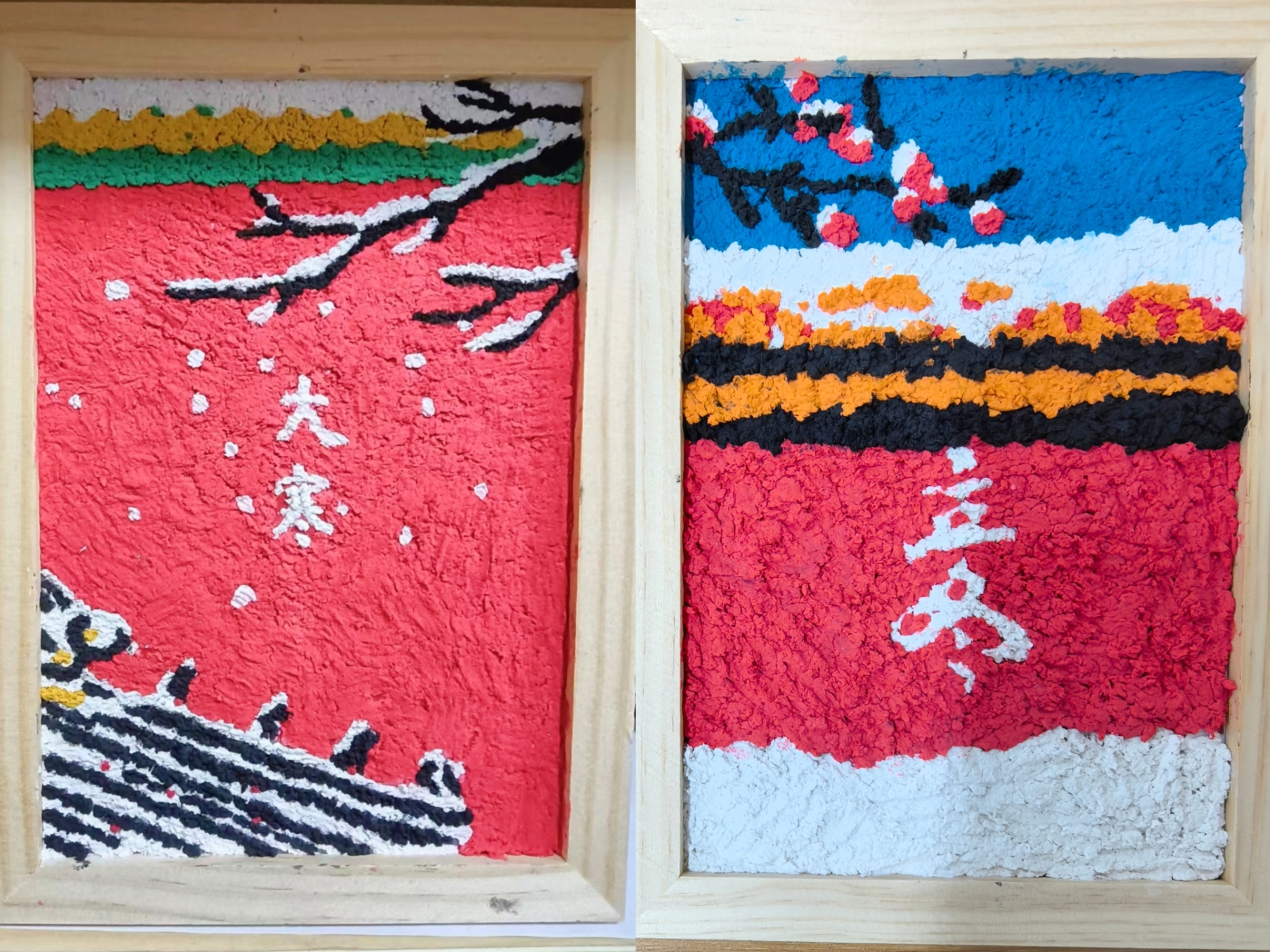 此外,王老师还向大家详细介绍了二十四节气这一古老的指导农耕文明的智慧。二十四节气不仅历史悠久,而且对人们的生产生活有着深远的影响。同学们用镊子、竹签等工具,通过古法纸浆制作技艺完成了一幅幅精美的节气作品,心中充满了自豪感。