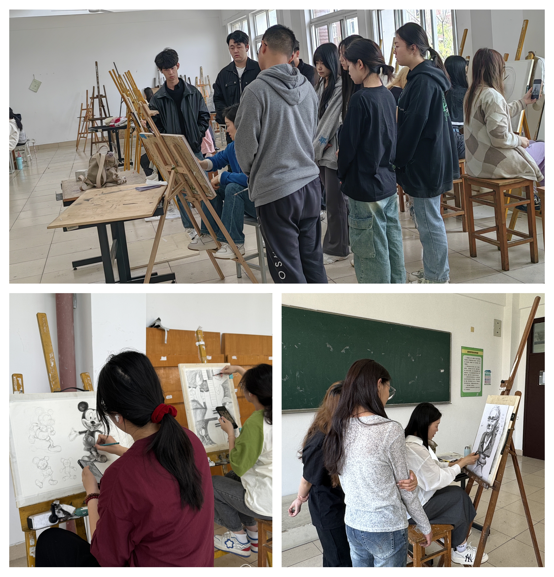 2023级建筑室内艺术设计专业的同学们作为刚进校的学生,学生的专业基础水平参差不齐。在这种情况下,袁荣花和郭力老师采用不同专业程度的不同的教学方法,课堂讲授绘画理论,课堂示范绘画方法。对专业基础好的同学,强调画面细节的处理,增进深入的能力,画面整体的把控,提高画面艺术感。无基础的同学从零开始,从拿笔,排线,理性观察,透视、比例、造型,最基本的单体几何体开始绘画,到几何体组合画面,再到静物单体,最后能够画出一组静物造型。