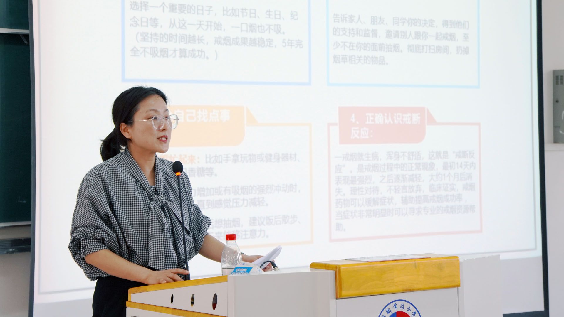 江宁区疾控中心贾秋萍老师也为同学们开展了一场无烟讲座,分享吸烟对健康的危害、戒烟方法和成功案例,提供科学实用的戒烟知识。