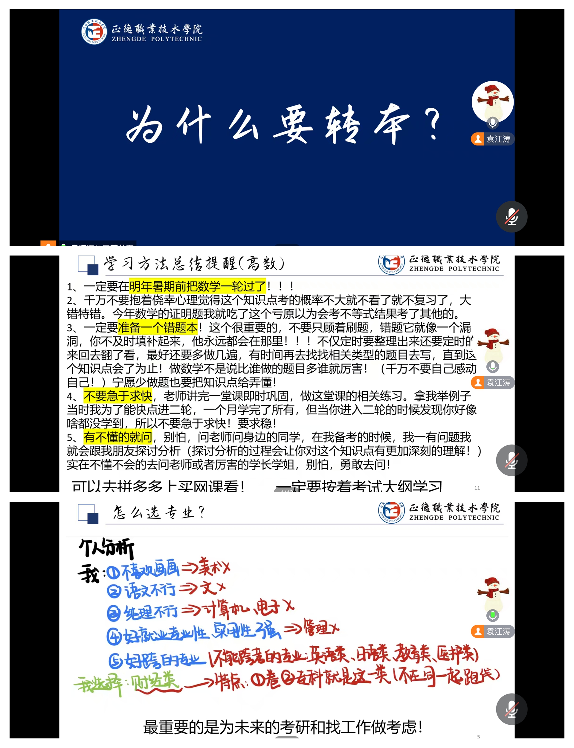 袁江涛从自身的真实学习经历出发,分享了自己在专科三年的学习规划以及备考经验,回忆起专转本备考的经历,袁江涛表示,为了弥补高考的遗憾,专转本一直就在他的规划里。但刚入学时的他还处于一个被动学习的状态。对于择校、备考规划都十分迷茫。在备考和择校上,辅导员闵济舜老师给了他很多建议,让他少走了很多弯路。后来在备考的过程中,袁江涛不断尝试新方法,调整自己的备考节奏,最终找到了最适合自己的一种。这说起来好像只是一句话的事,但是只有真正经历过才知其中的不易。他鼓励同学们把未知的可能性通过不懈努力,转化为自己的能力甚至是优势,坚定自己作为艺建人的自豪,积极主动提升个人综合能力。