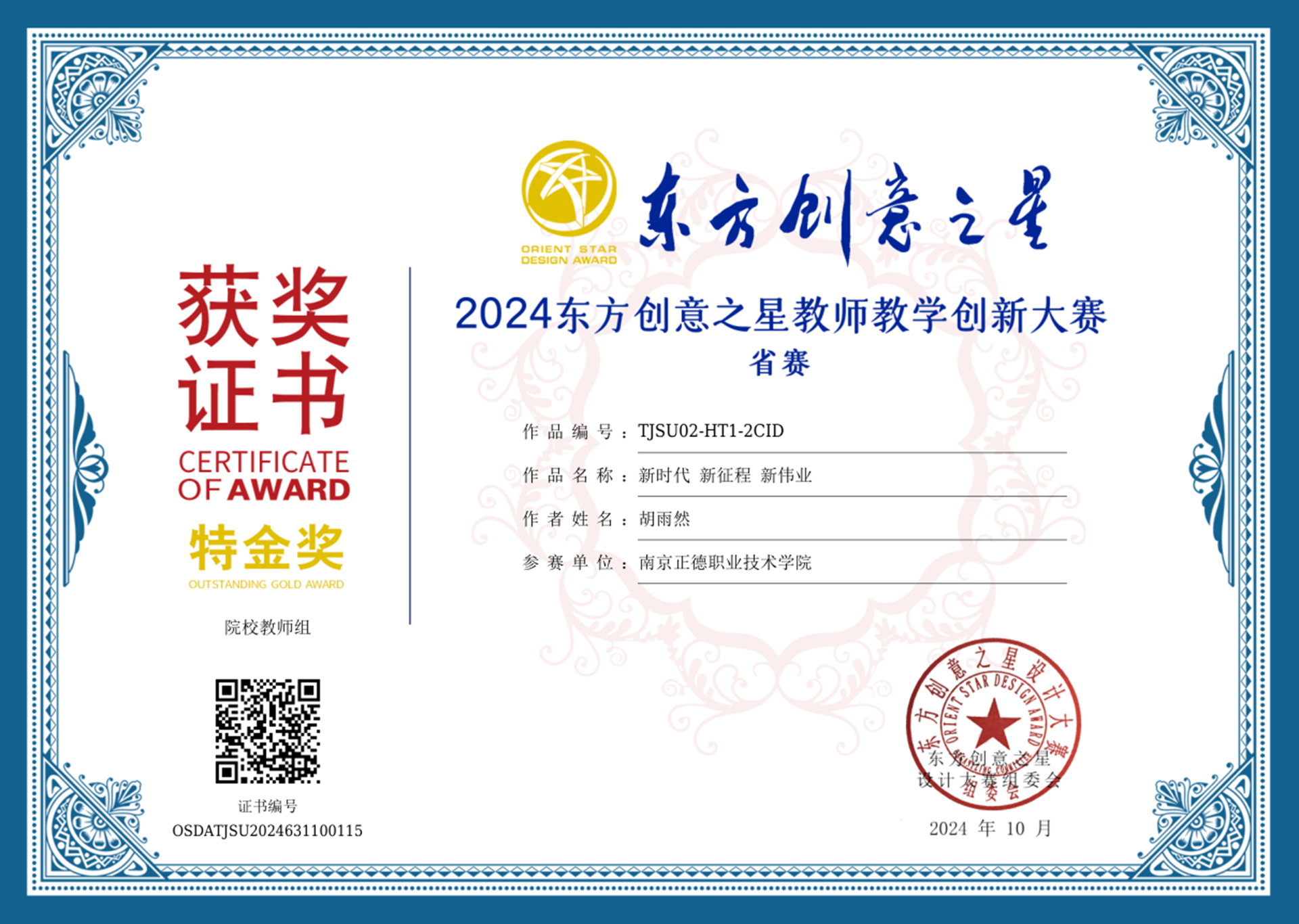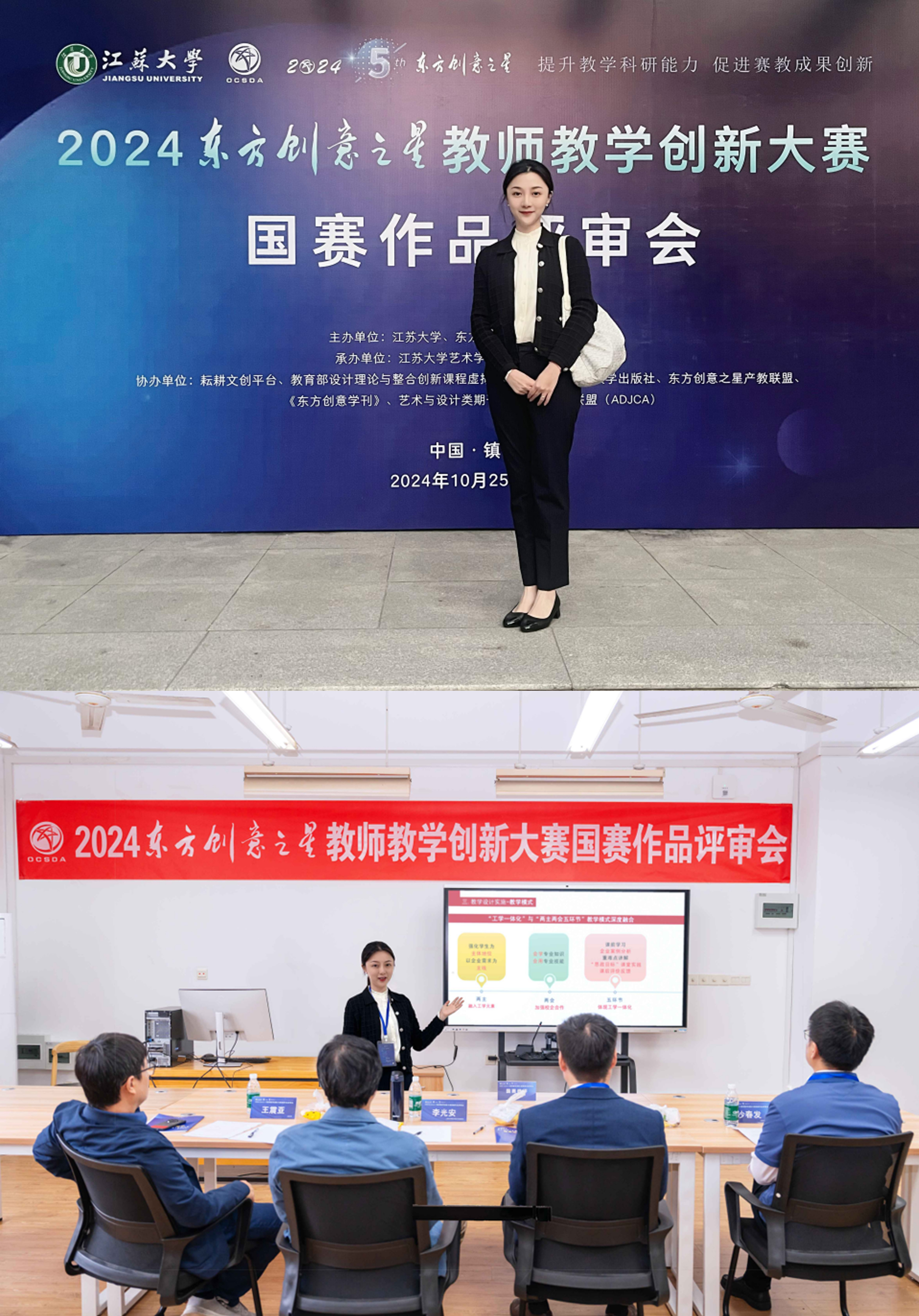 2024年10月25—28日,2024东方创意之星教师教学创新大赛(以下简称教师赛)国赛评审会在江苏大学隆重举行。来自工业和信息化部国际经济技术合作中心、江苏大学、中国美术学院、同济大学、南京工业大学、东南大学、华东师范大学、中国计量大学、山东大学、大连工业大学、上海工程技术大学、《上海视觉》学报等国内著名院校及设计行业的22位领导、知名教授及专家组成国赛评委会,参加了本次国赛终评工作。来自全国25个省区市的96家单位(涵盖天津美术学院和上海大学、东华大学、中南大学等14所“双一流”高校),共计126位代表(23位院长/副院长/教务处长,1位博士生导师、2位博士后、36位博士,45位教授/副教授等高层次参赛作者)参加了线下答辩。户外露出 艺术设计与建筑工程系的王陶老师,在现场授课答辩环节中,全面展现了其卓越的教学技能与创新性成果。经由评审专家团的严格评审,荣获东方创意之星教师教学创新大赛国赛金奖。