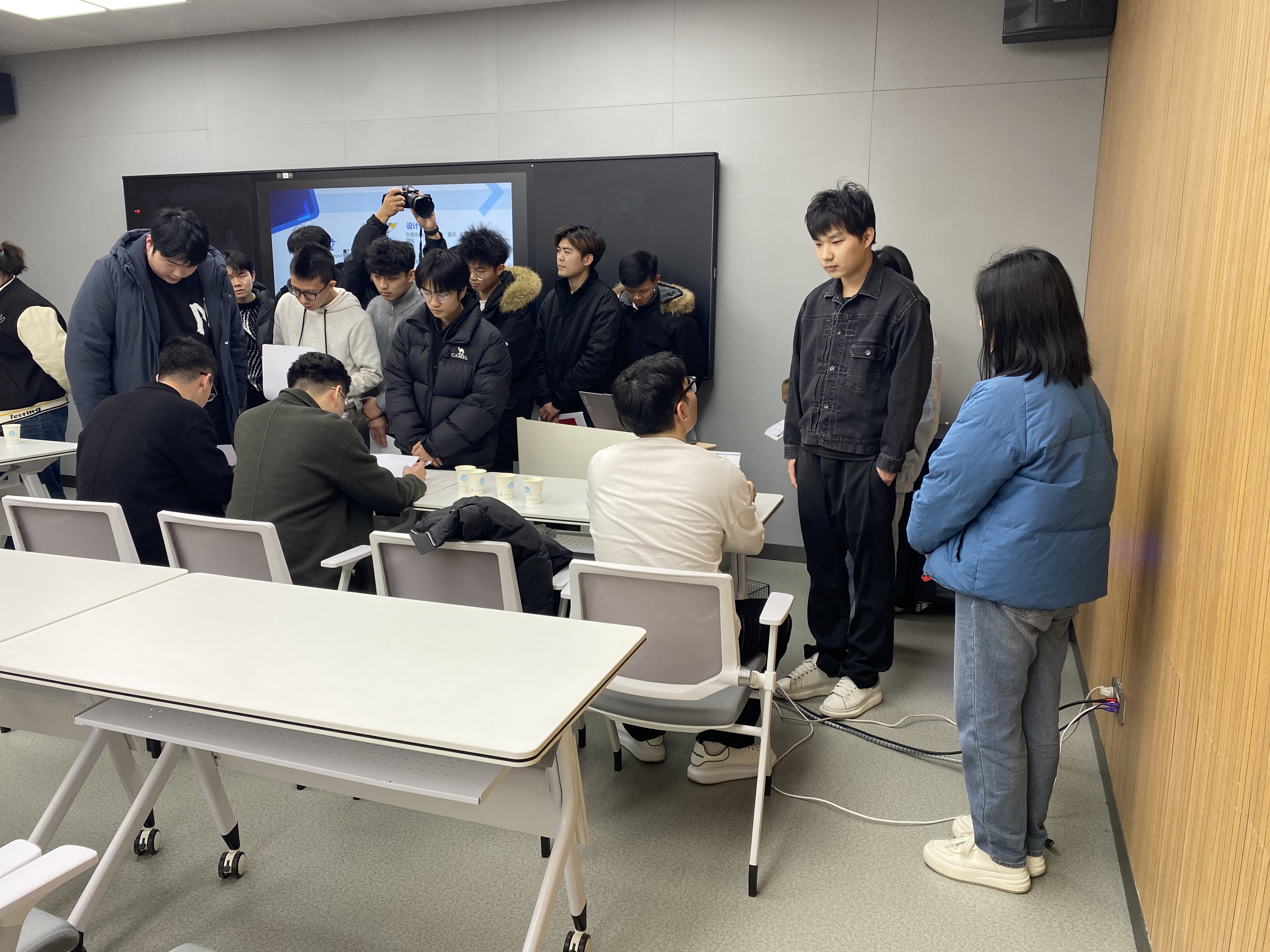 宣讲会结束后,南京铭望装饰设计有限公司的师菊慧、陆杰、梁东海、王纪纲等多位资深设计师,对同学们进行了一对一的面试指导。面试环节中,户外露出 同学们积极准备,纷纷递交简历、进行自我介绍,并通过互加微信等方式与用人单位建立了初步联系。与会的设计师们以热情、细致、耐心的态度,与同学们进行了深入沟通,会场气氛热烈而活跃。