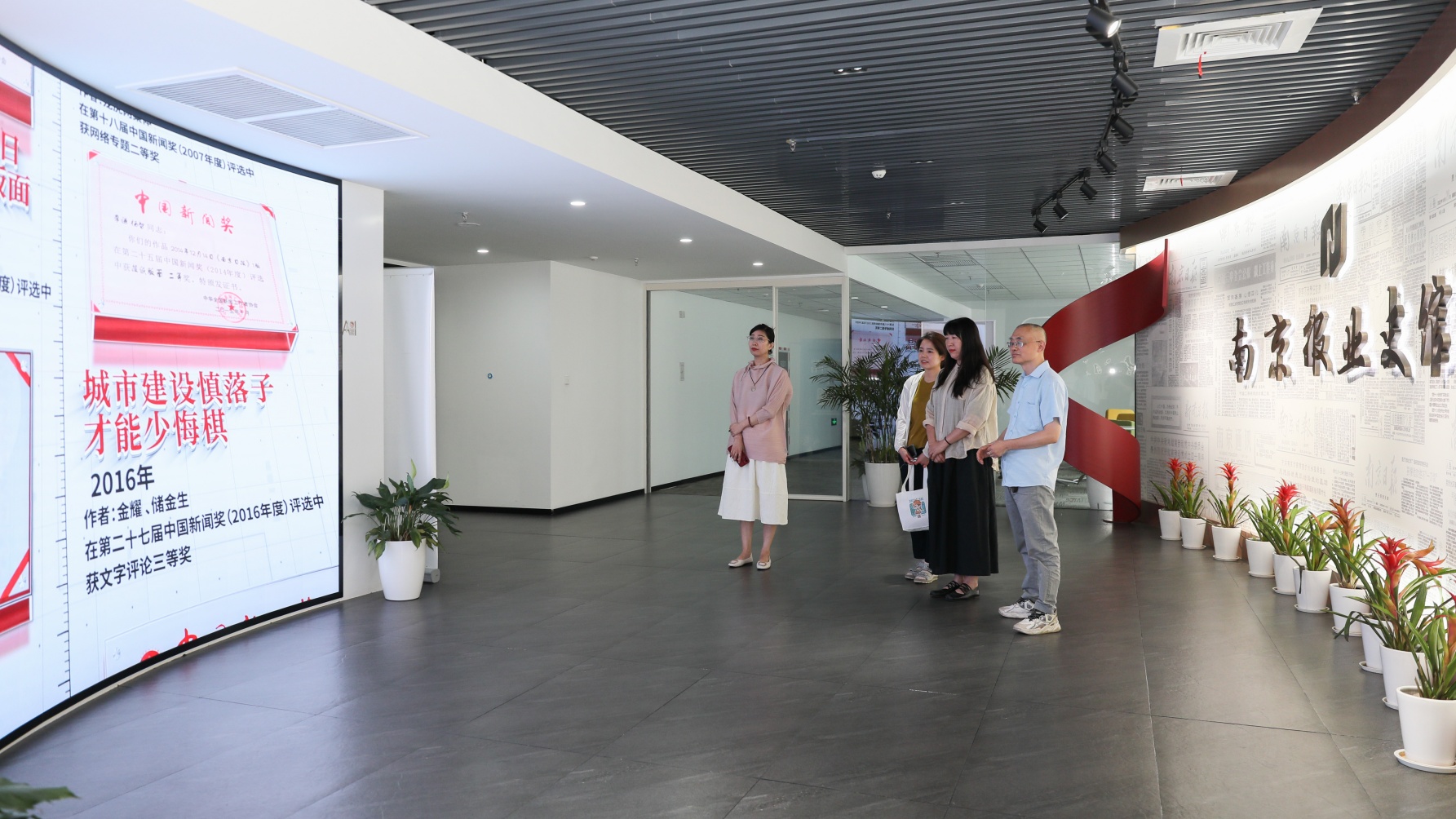 陈青阳一行还参观了南京报业史馆,南京报业史馆以“党报基因代代相传”为主题,在报史馆讲解员的带领下,深入了解南京日报的创刊背景和发展历程。通过大量文字图片、影像资料,随行老师们看到了一代代南报人薪火相传的奋斗精神,回望了不同时代下南京的真实面貌。随后又参观了南京日报集团融媒体中心,了解他们演播室、录音室、采编系统等先进的融媒体设备与技术。蔚薇主任表示欢迎艺建系的学生们来报业集团体验先进的设备,进行一些节目内容的录制等。