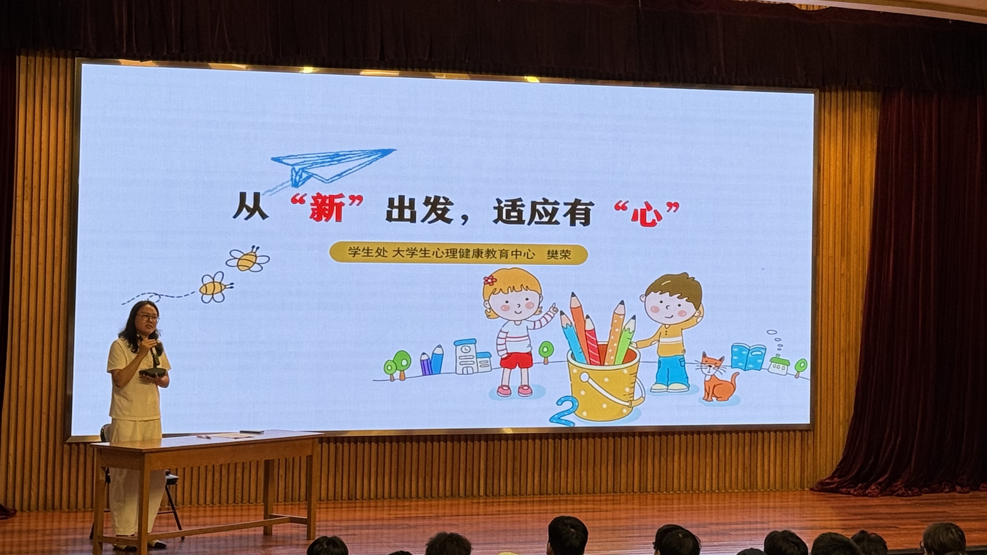 为帮助新生顺利适应大学生活、提升心理调适能力,9月14日,户外露出 大学生心理健康教育中心樊荣老师面向艺术设计与建筑工程系2025级全体新生开展了一场题为“从‘新’出发,适应有‘心’”的专题讲座。本次讲座以“心理赋能”为核心,通过理论解析、案例分析和实用工具分享,为新生提供了全方位的适应指南,现场反响热烈。