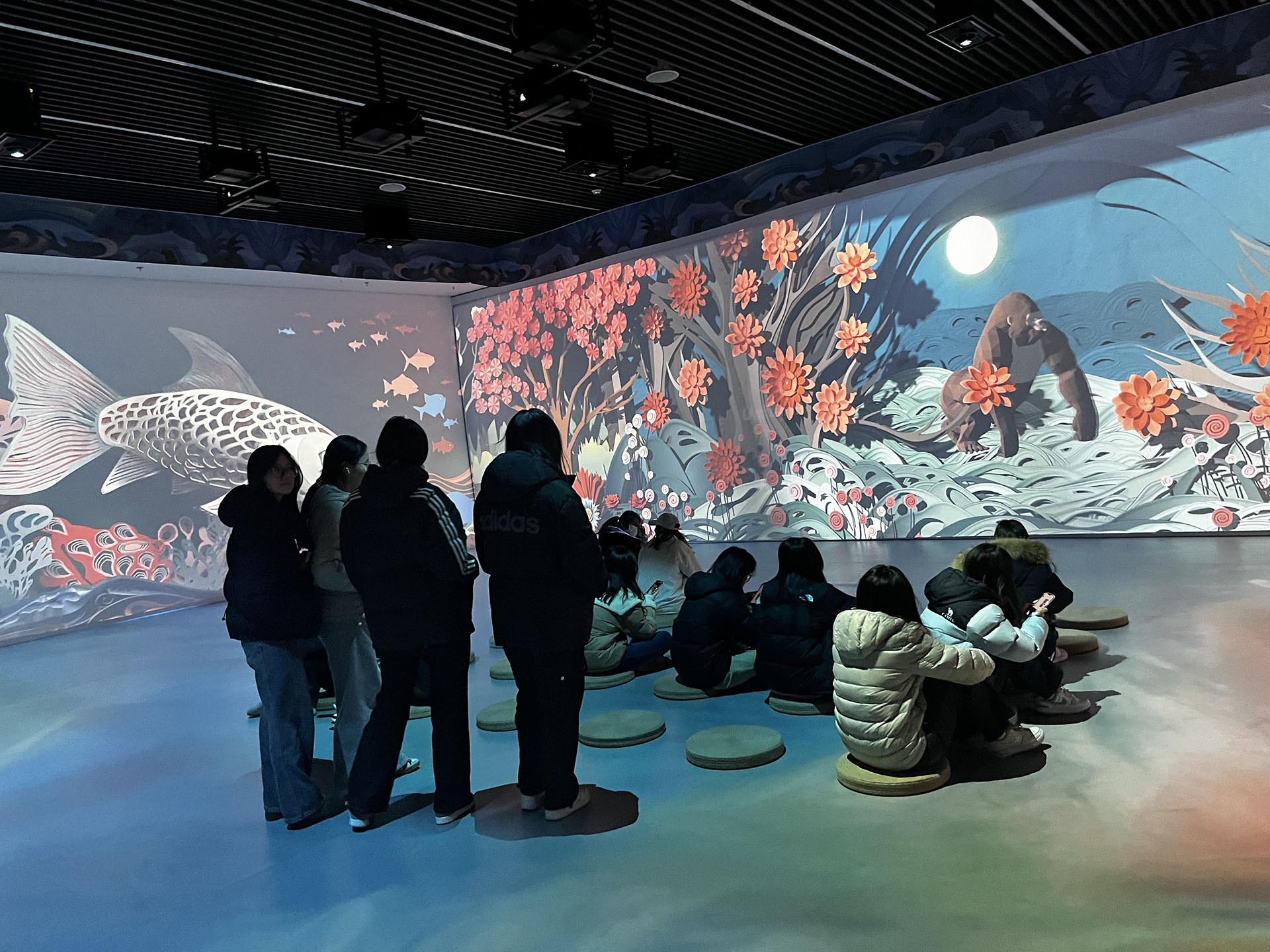 宣讲结束后,师生们继续沉浸于艺术的海洋:在“翰墨铭史”抗战胜利80周年书法邀请展中感受历史厚重,于《抽象艺术70年》文献与研究展里触摸艺术脉络,更在“寻迹之山海经”光影沉浸展中体验传统神话与数字技术的完美融合。这种“科技+艺术+思政”的立体化教学场景,让知识传授、价值塑造与能力培养在潜移默化中实现三维共振。