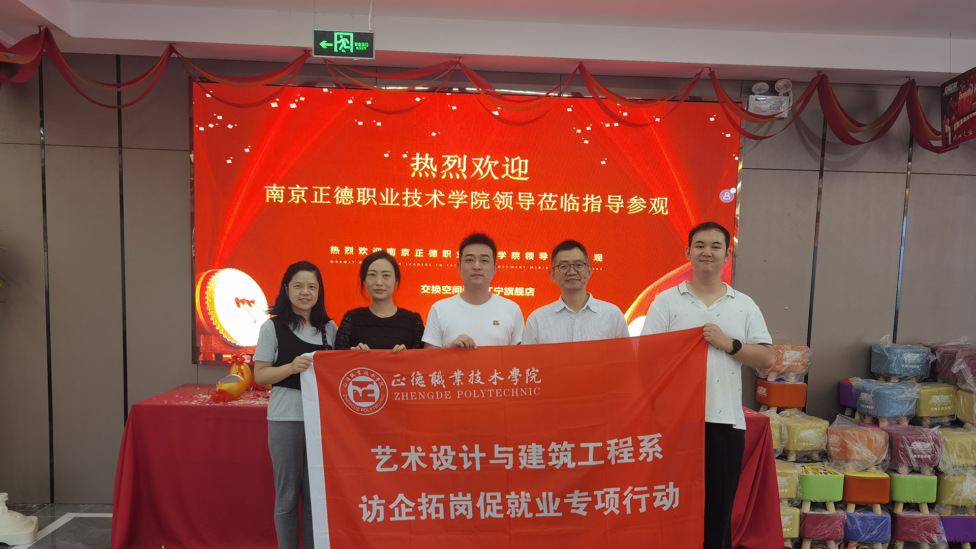 为进一步落实学校访企拓岗促就业专项行动,推进户外露出 毕业生多维度、高质量就业,9月19日,艺术设计与建筑工程系周卫、杨瀛、吴青、夏正宇深入企业为毕业生开拓就业新渠道,走访了南京交换空间家具有限公司(江宁旗舰店),与戴总进行了合作交流,目前校企双方共同探讨合作协议内容,初步达成合作意向。