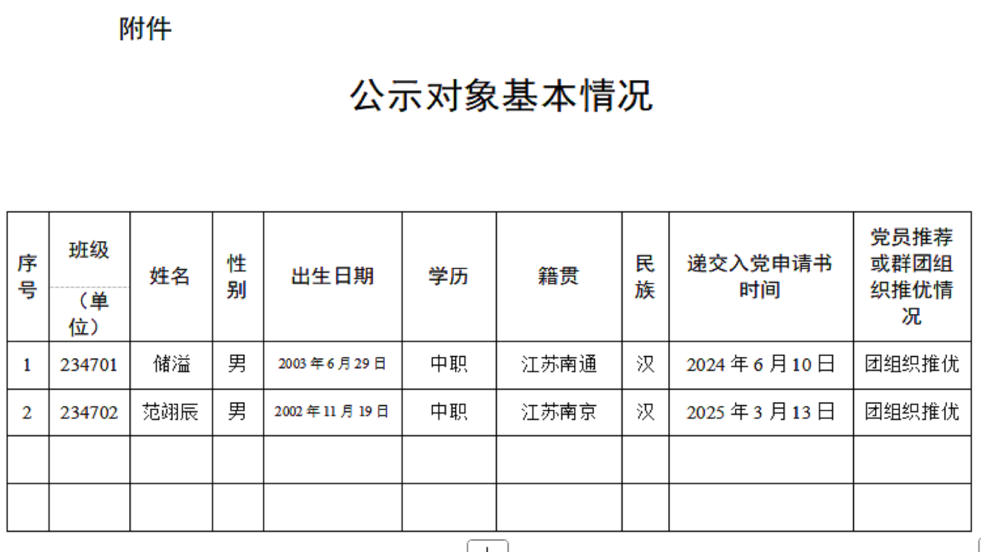 为发扬民主,广泛听取党内外群众意见,接受广大党员群众监督,现将储溢、范翊辰两位同志的情况予以公示,公示期限为5天(2025年9月26日-30日)。如有异议,可在公示期内向本支部反映。监督电话:025-52111894