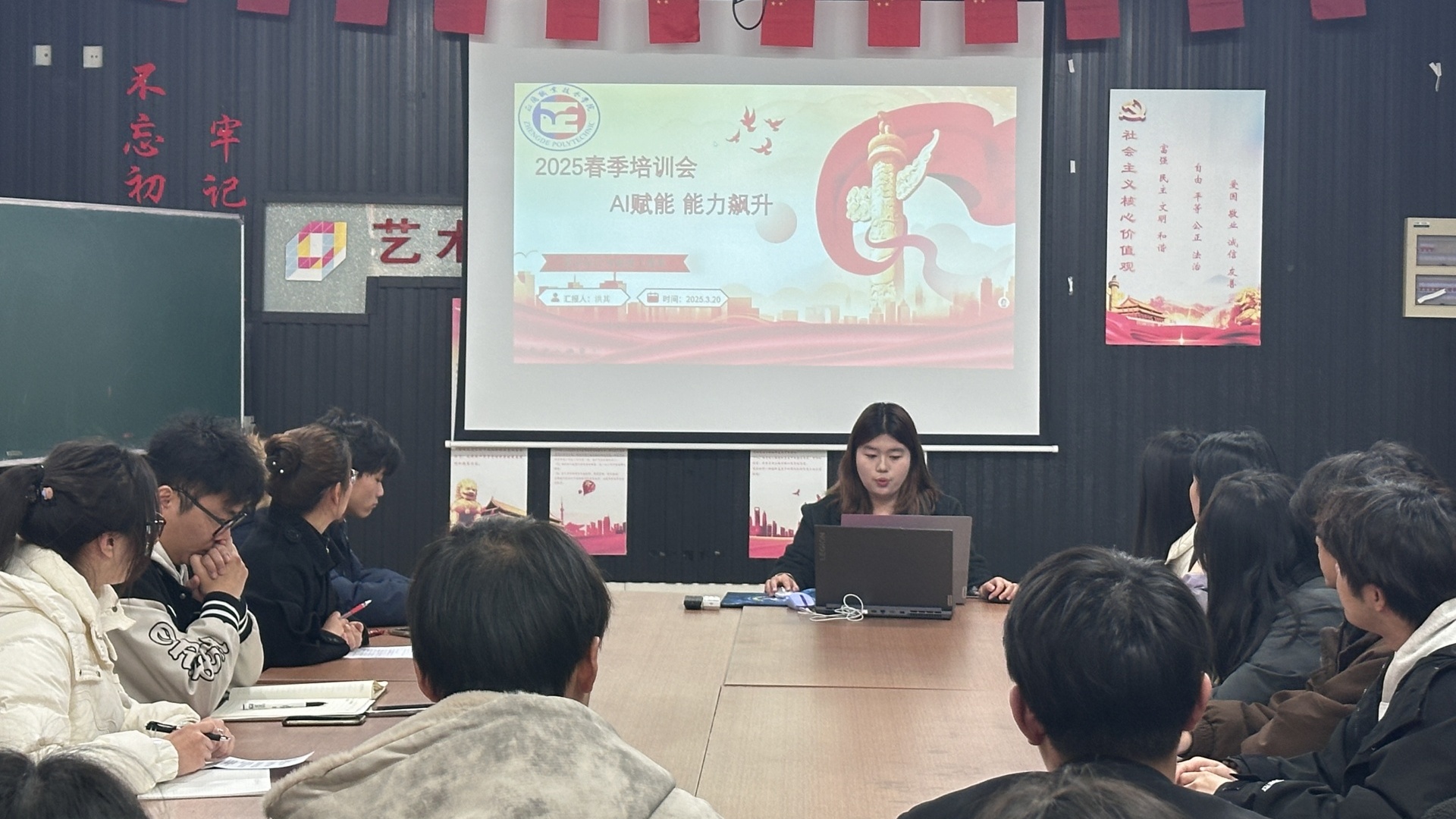 培训会伊始,系学生会优秀成员洪其同学以“AI赋能,能力飙升”为主题,分享了她在学习和工作中运用人工智能技术的经验。洪其同学结合自身经历,从AI辅助设计、数据分析、文案创作等方面,详细讲解了如何利用AI工具提升工作效率和质量。她生动形象的案例和深入浅出的讲解,引发了在场同学的浓厚兴趣和热烈讨论。