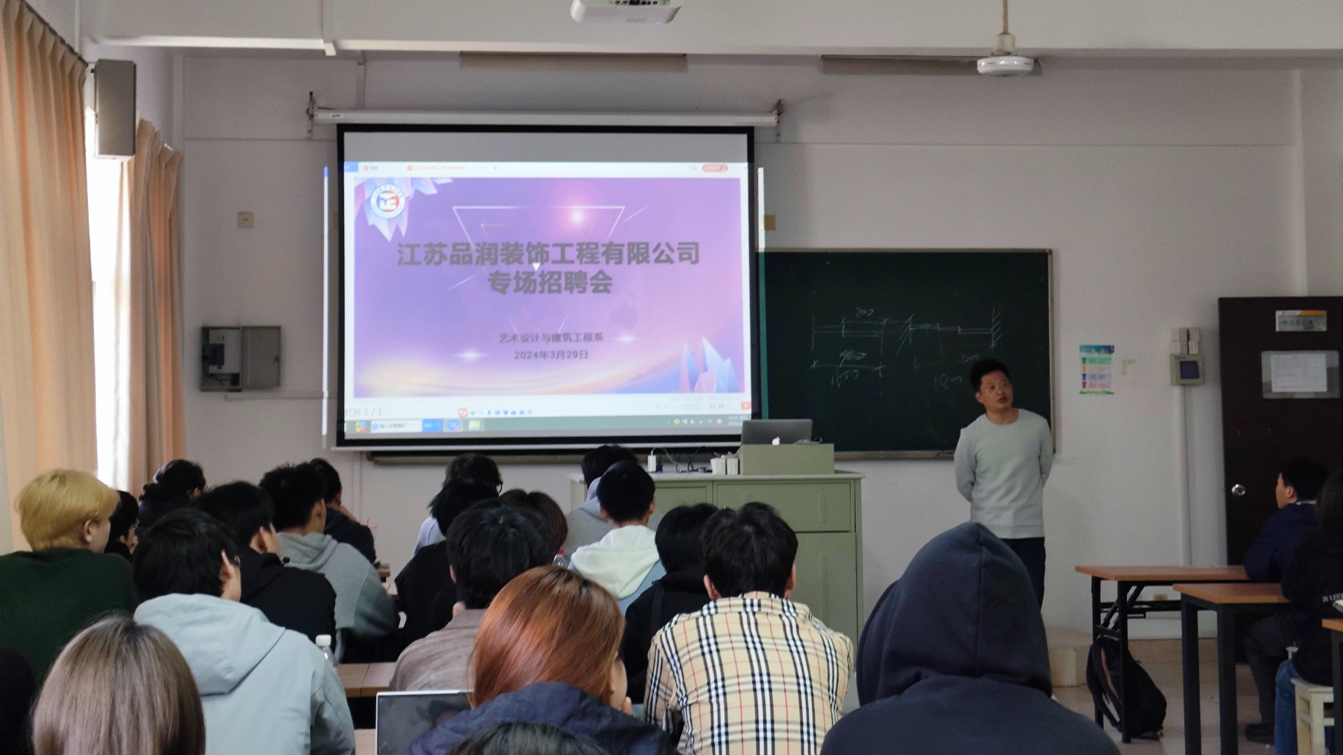 3月29日,江苏品润装饰工程有限公司走进艺术设计与建筑工程系,举办了一场别开生面的企业宣讲会。此次活动旨在加强企业与学校之间的合作,为艺术设计与建筑工程系的学生提供更多了解行业、拓展职业视野的机会,同时也为企业选拔优秀人才搭建了一个良好的平台。
