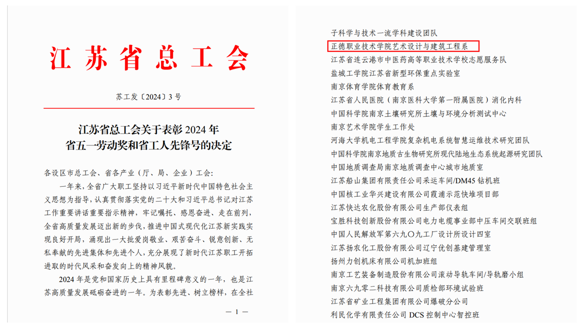 为表彰先进、树立榜样,在全社会弘扬劳模精神、劳动精神、工匠精神,4月23日,江苏省总工会下发了《关于表彰2024年省五一劳动奖和省工人先锋号的决定》的通知,艺术设计与建筑工程系荣获江苏省“工人先锋号”荣誉称号。