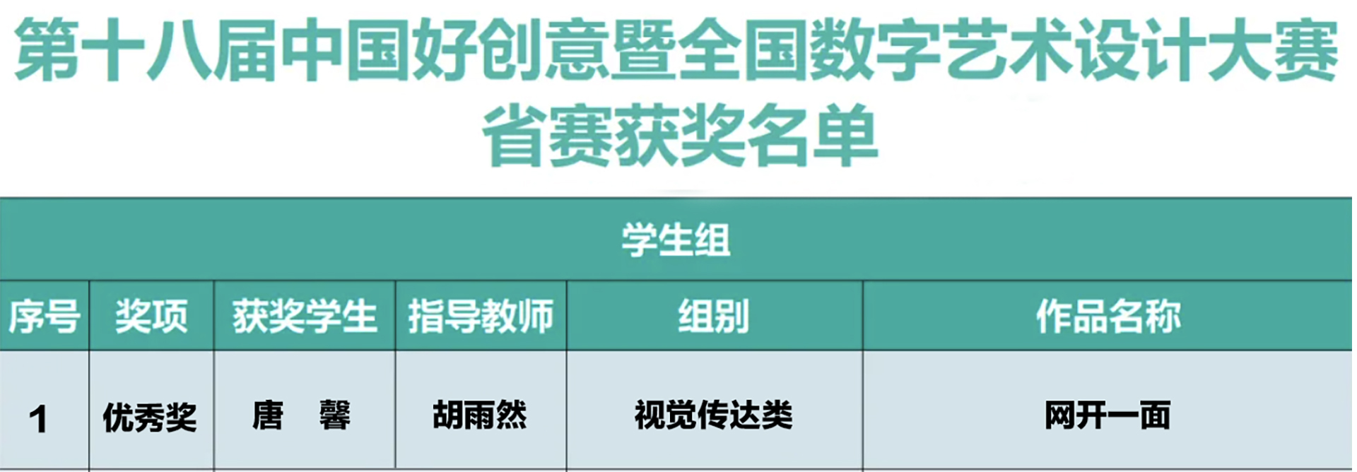 近日,第十八届中国好创意暨全国数字艺术设计大赛落下帷幕。艺术设计与建筑工程系师生荣获国家级一等奖1项、二等奖1项、三等奖2项,省级优秀奖1项,获奖数量创历史新高!胡雨然、王陶两位老师荣获了优秀指导教师奖。这一系列佳绩不仅彰显了我系在数字媒体技术领域的雄厚实力,也为学生和教师们的辛勤付出和才华展现画上了浓墨重彩的一笔。