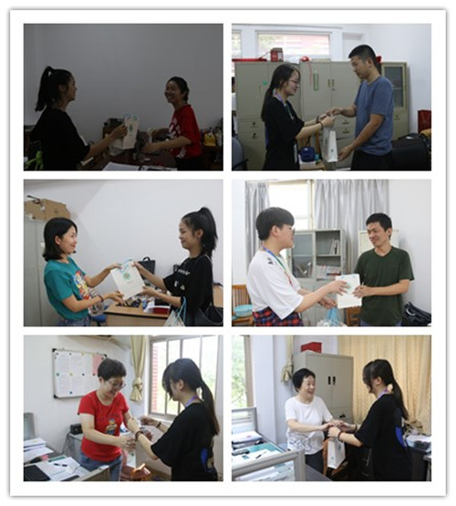 教师节前夜,学生会、广播台、社联的数十名志愿者,将为全院教师准备的消毒湿纸巾、医用防护口罩、免洗手消毒凝胶进行分拆装入精美的礼品袋,9月10日一早志愿者们手捧着一份份精致可爱的小礼物,在一声声“教师节快乐!”的问候声中,深情地向将充满浓浓爱意的礼物送到全院每一位老师的手中,让老师们在欢乐的节日氛围中开始一天的教育教学工作。