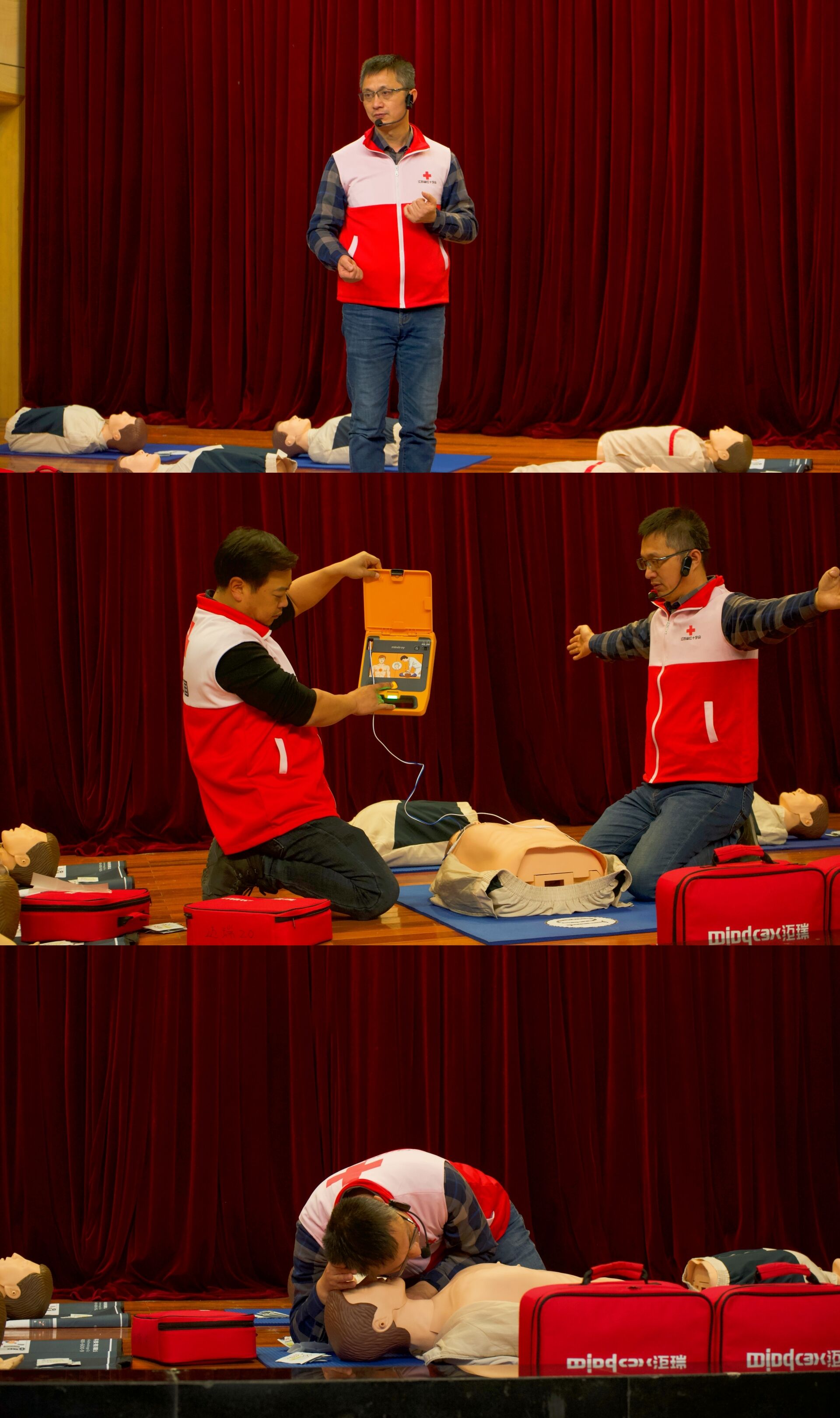 实操部分,蓝豹救援队的徐海老师重点演示了如何对伤员进行心肺复苏以及AED的正确使用方法。在演练中,同学们踊跃参与模拟情景,积极提问急救问题,徐海老师现场给予详细解答。随后大家按照心肺复苏的操作流程和技术要点,认真练习胸外按压、人工呼吸和自动体外除颤仪的使用。市红会为考核通过的学员现场颁发红十字救护员CPR+AED合格证。