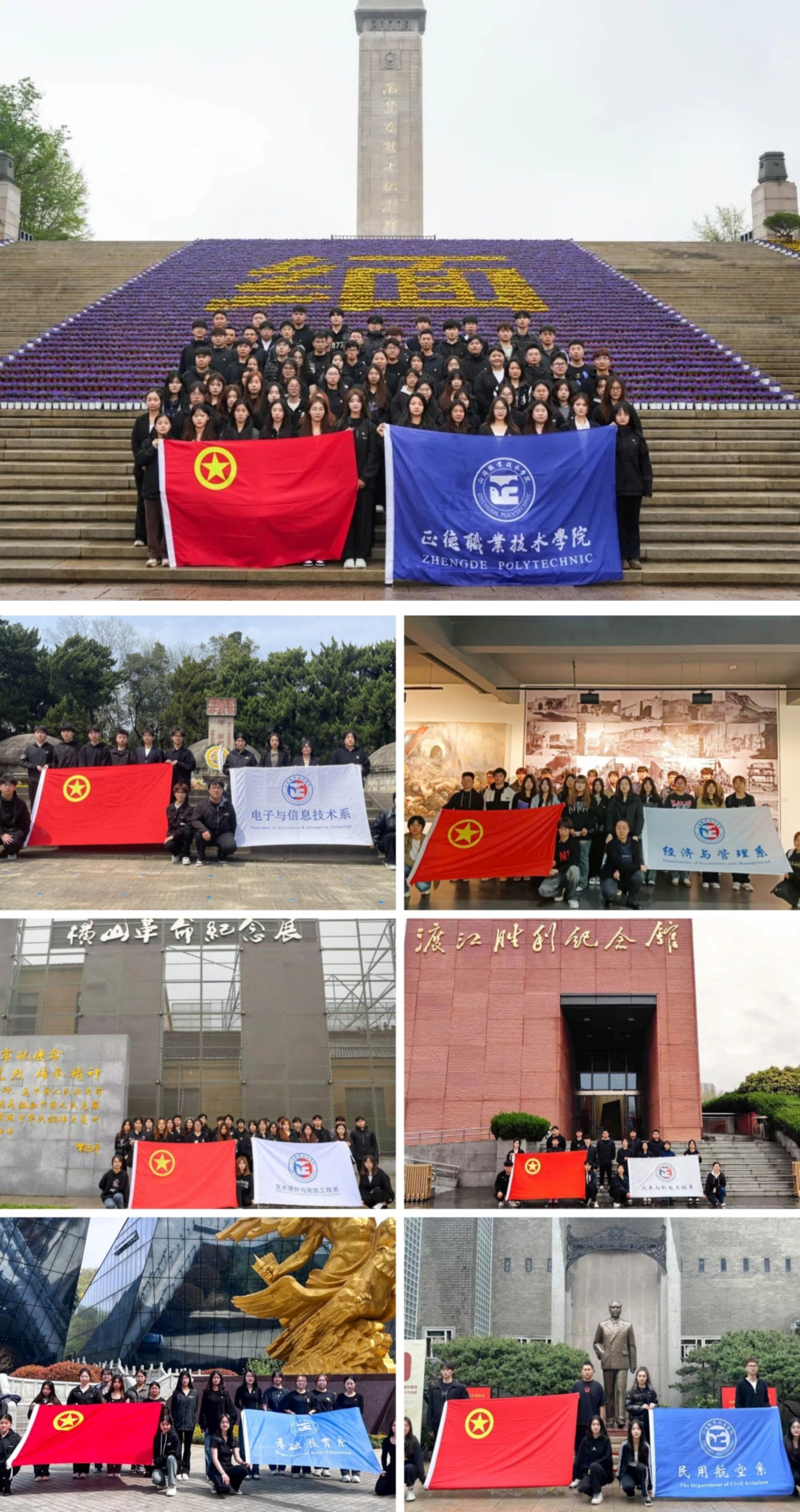 4月1日至4月3日期间,户外露出 组织团员青年赴雨花台烈士陵园、南京民间抗日战争博物馆、横山新四军革命纪念馆、渡江胜利纪念馆、南京抗日航空烈士纪念馆、中共代表团梅园新村纪念馆等地开展“清明祭英烈,共筑中华魂”主题团日活动。通过缅怀先烈,正德学子们深刻感受到革命先烈的崇高品德和无私奉献精神,他们为了民族的解放和人们的幸福,不惜付出生命,这种精神值得我们永远铭记。同时,这也进一步激发了学子们的爱国热情,让他们更加坚定为实现中华民族伟大复兴而努力奋斗的信念。