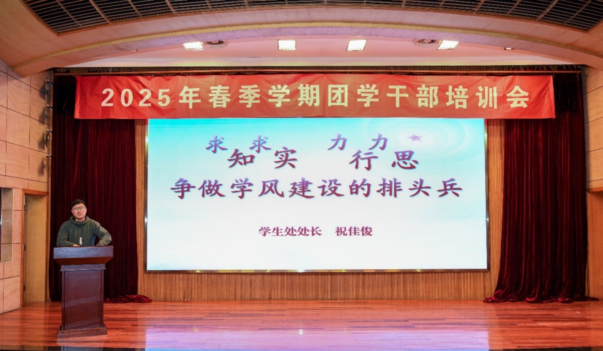 祝佳俊以《“求知求实,力行力思”——争做学风建设的排头兵》为题,为团学干部们上了一堂生动的思政课。他指出,团学干部作为学生中的佼佼者,应该以身作则,模范践行“敏于行、勤于思”的学风,积极参与学风建设活动,争做学风建设的排头兵。他还就如何提升团学干部的组织能力和服务意识提出了具体要求,鼓励大家以实际行动践行责任与担当,为学风建设贡献力量。