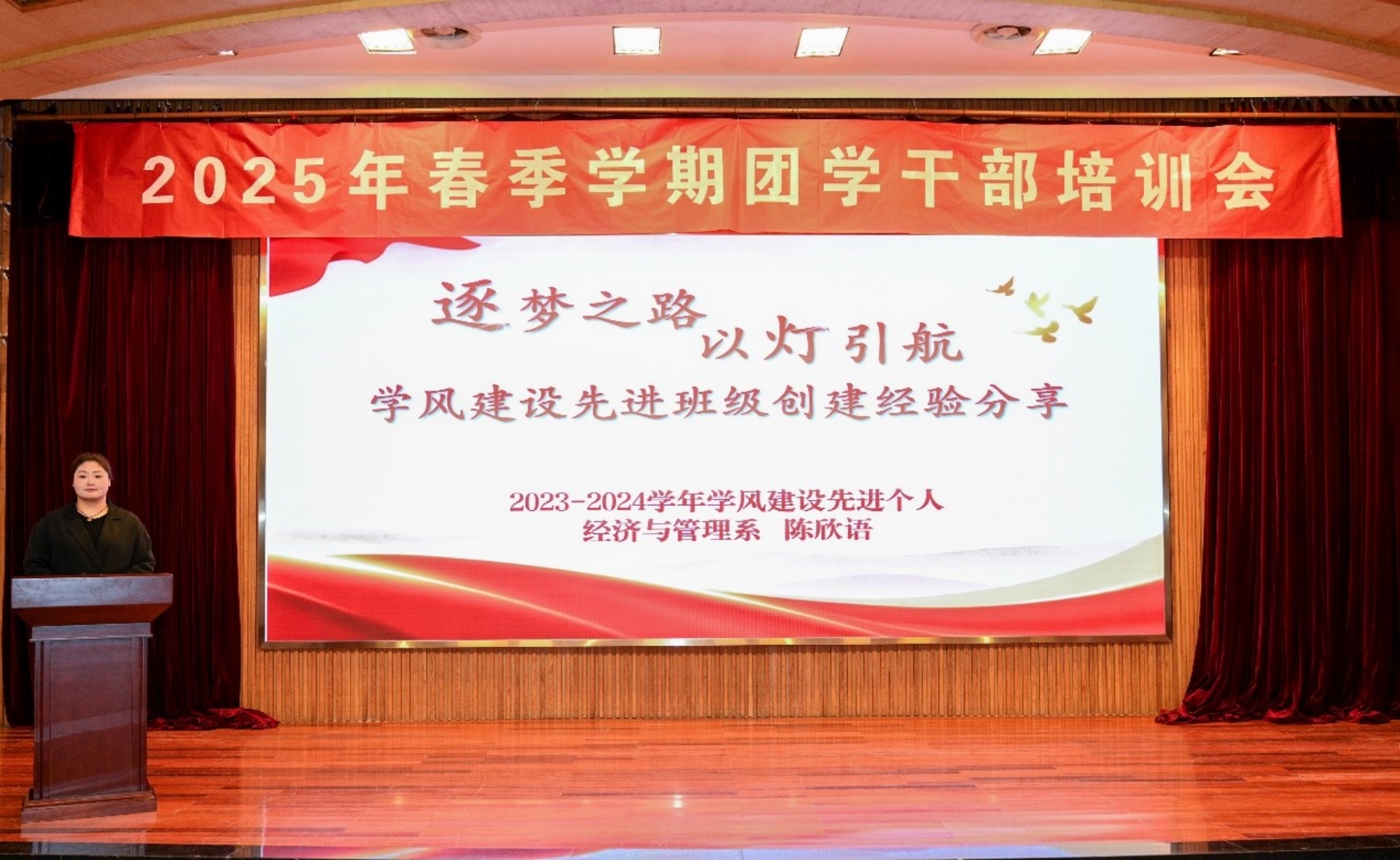 会上,2023-2024学年学风建设先进个人、经济与管理系的陈欣语同学,带来了题为《“逐梦之路,以灯引航”——学风建设先进班级创建经验分享》的精彩演讲。她结合个人经历与班级实践,生动讲述了如何通过创新班级管理模式、激发学习热情、营造积极氛围等措施,推动班级学风建设取得显著成效,为与会团学干部提供了宝贵的经验和启示。