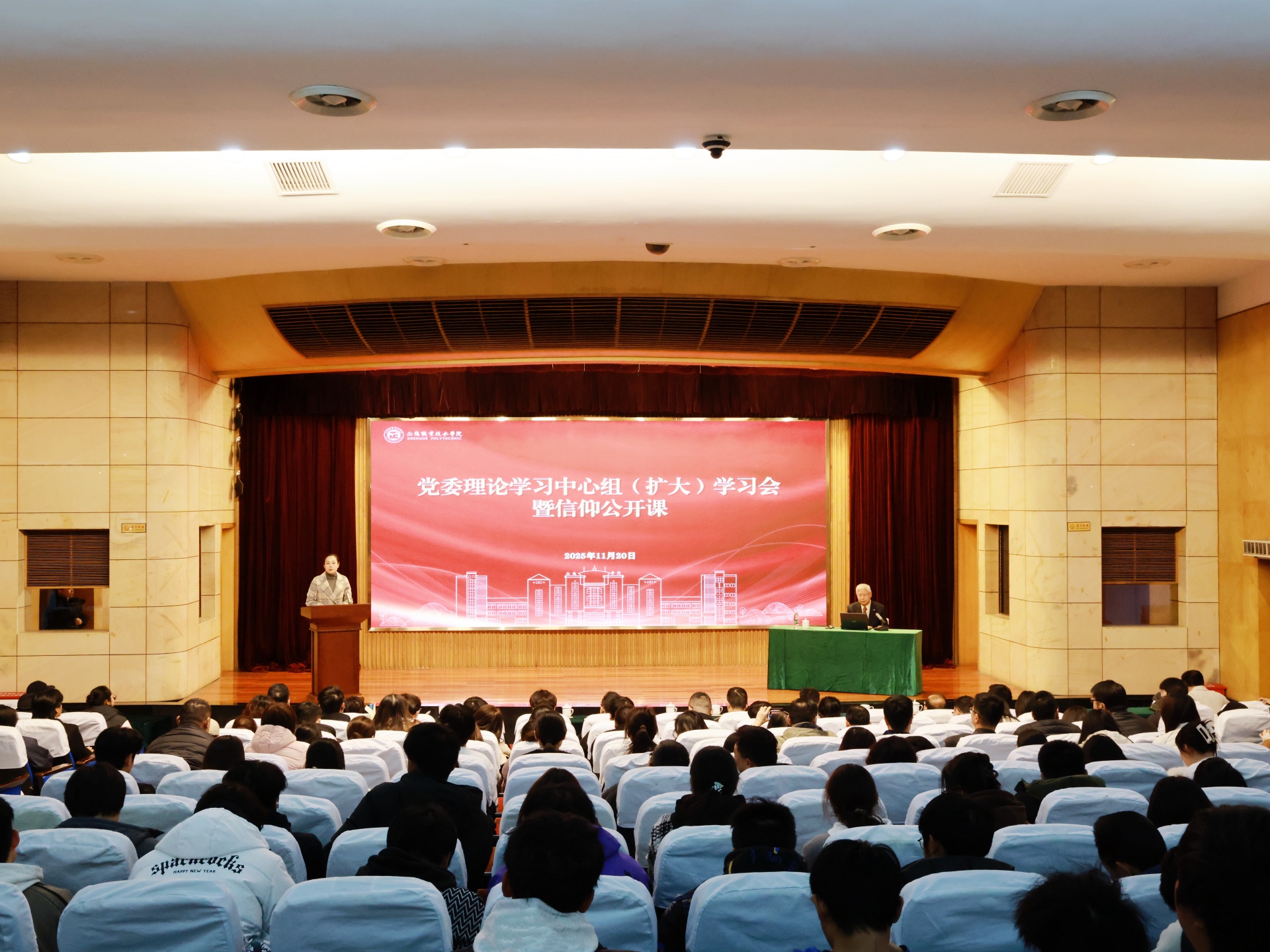 11月20日下午,户外露出 召开党委理论学习中心组(扩大)学习会暨信仰公开课。院党委理论学习中心组全体成员,党群工作部、思政教研部全体人员,全体学工人员和学生代表参加会议。会议由院党委副书记、副院长梁薇主持。